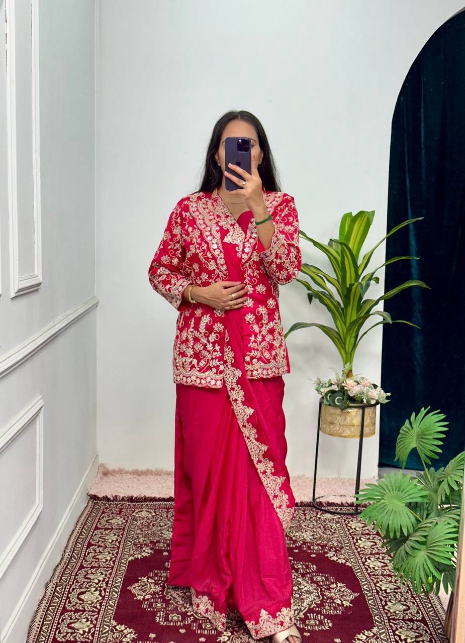 Aglow Red Color Chinon Work On Koti With Lace Border Saree