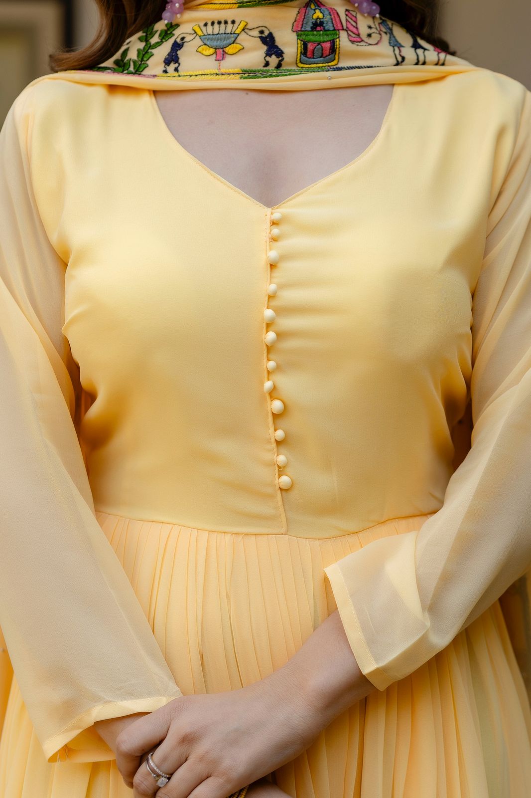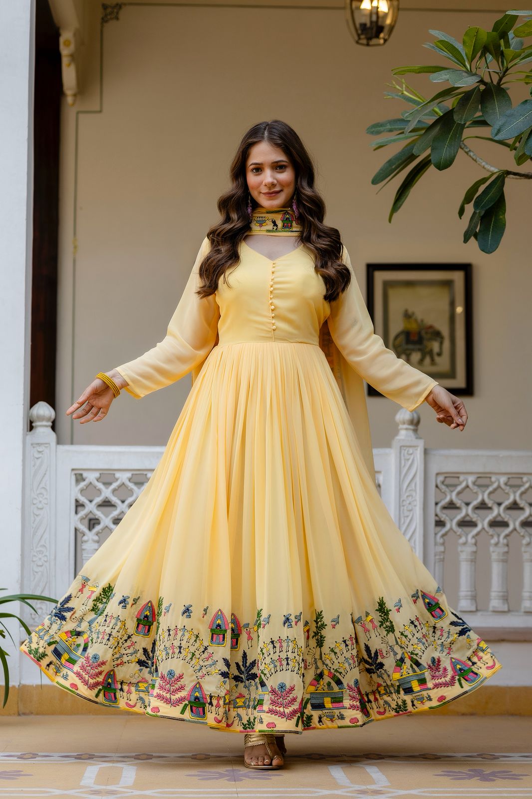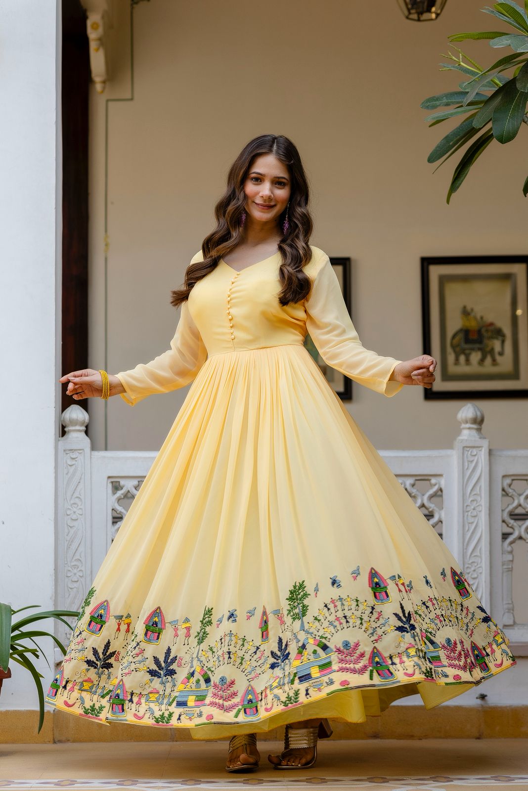 RR 41 Yellow Faux Georgette Gown Perfect for Wedding, Party, Makar Sankranti, Karwa Chauth, Ethnic Day – . Now at just ₹2599. Delivery 4-6 Working D | Gowns, Bollywood Gowns, Creative Gowns, Designer Gowns, Embroidered Gowns, Party Wear Gowns