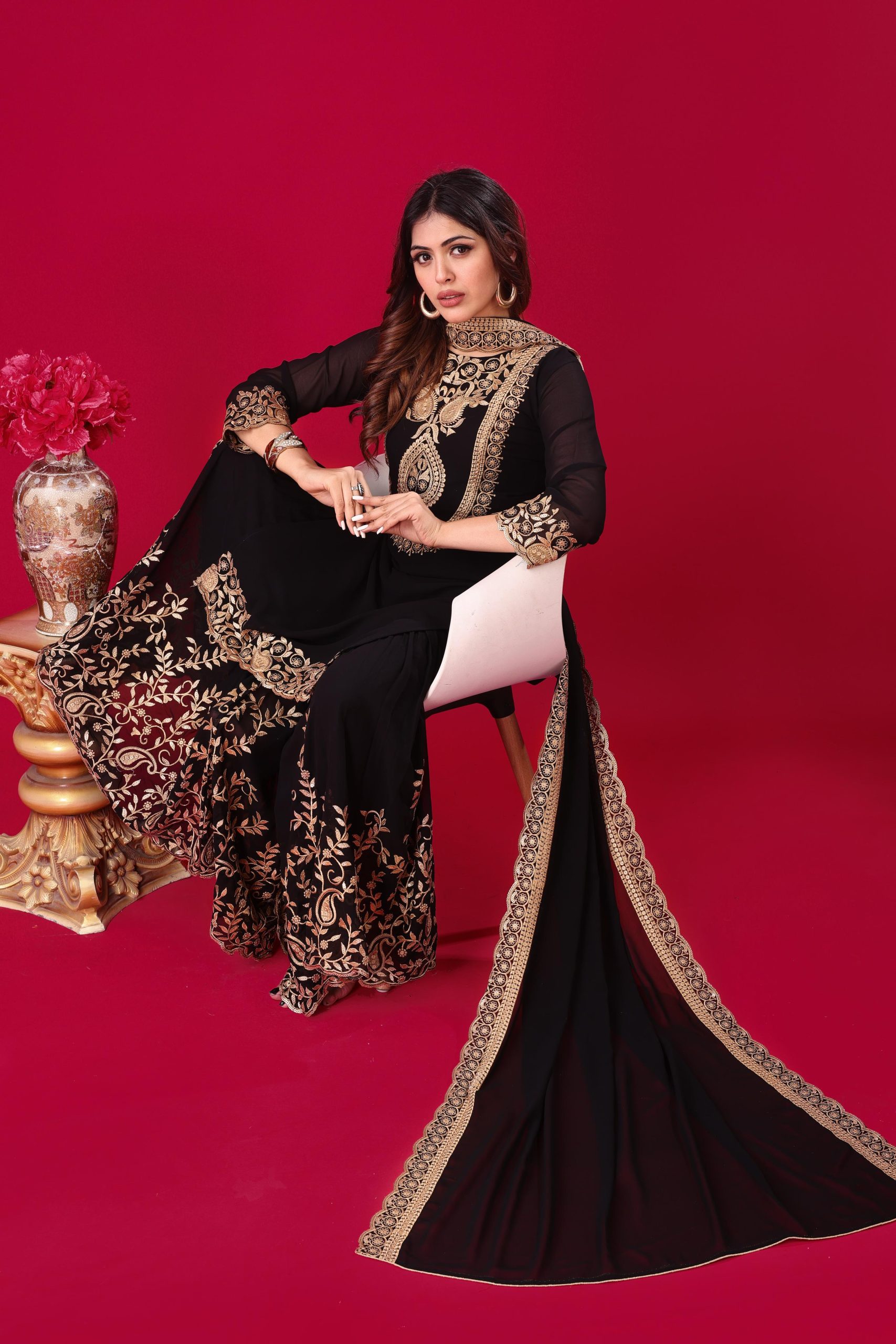 Fabrics | Top Fabric : Blooming Faux Georgette Work : Heavy Embroidery Sequence Thread Work With Full Sleeve Top Inner : Heavy Micro Cotton Top Size : Free Size Fully Stitched Ready To Wear Top Length : 36-37 Inch Palazzo Fabrics : Blooming Faux Georgette With Elastic Full stitched Palazzo inner : Heavy Micro Cotton fully stitched Palazzo Length : 40-41 Inch Dupatta : Blooming Faux Georgette With Embroidery Sequence Work With Lace Border |