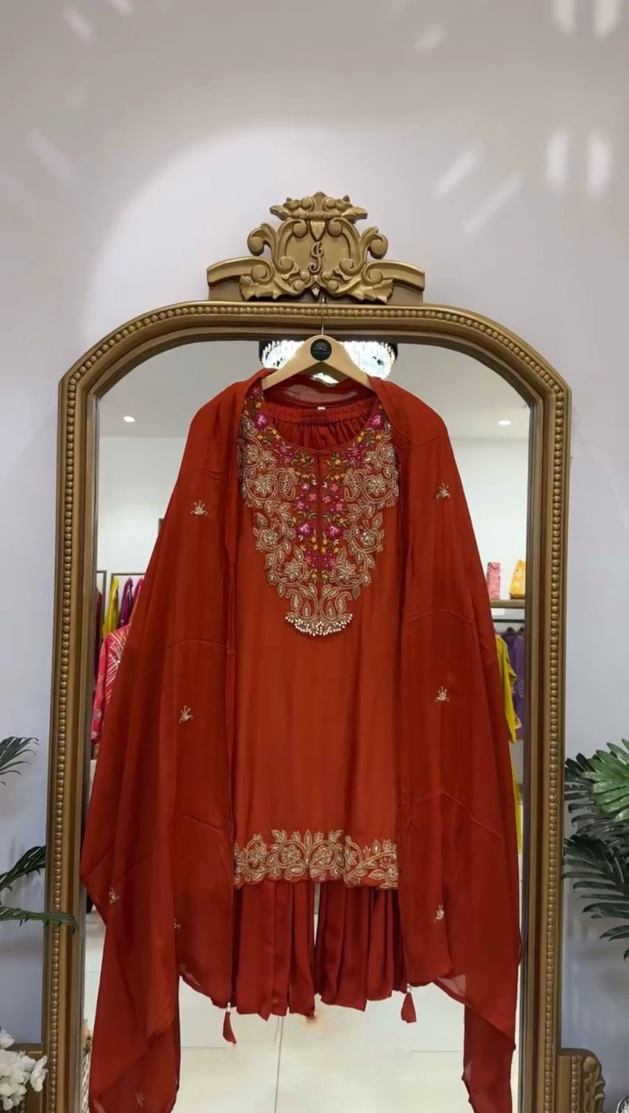 Fabrics | Top Fabric : Heavy Faux Georgette Work : Heavy 5mm Embroidery Sequence Work With Full Sleeve Palazzo Fabrics : Heavy Pure Faux Georgette With 5mm Embroidery Sequence With Fully Flair Palazzo inner : Heavy Micro Cotton fully stitched Palazzo Length : 40-41 Inch Dupatta Work : Heavy Faux Georgette With Embroidery Sequence Work |