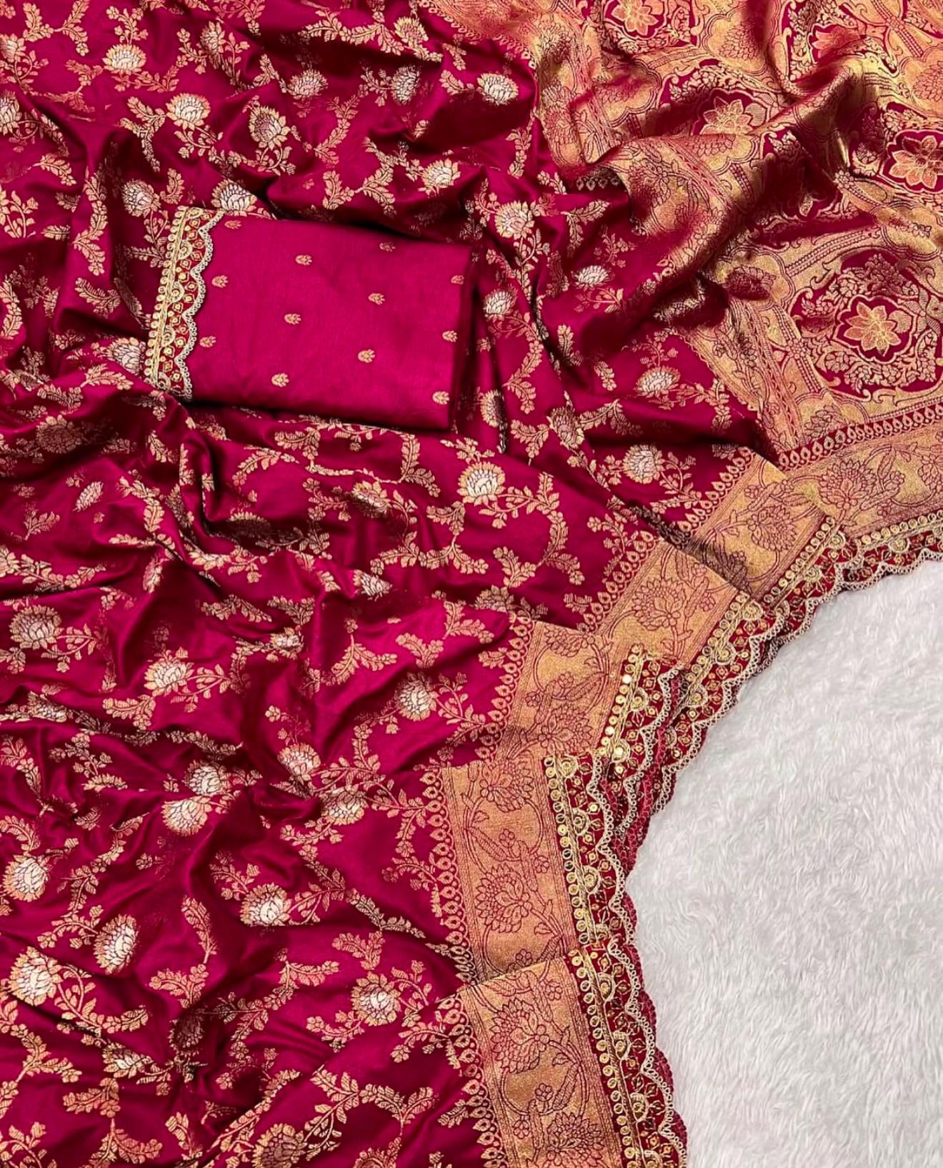Fabrics | Saree : jacquard weaving saree work : weaving pallu and blouse also attached embroidery cording lace saree Blouse : embroidery cording laceSaree cut : 5.50+ meter Blouse : 0.80 Meter |
