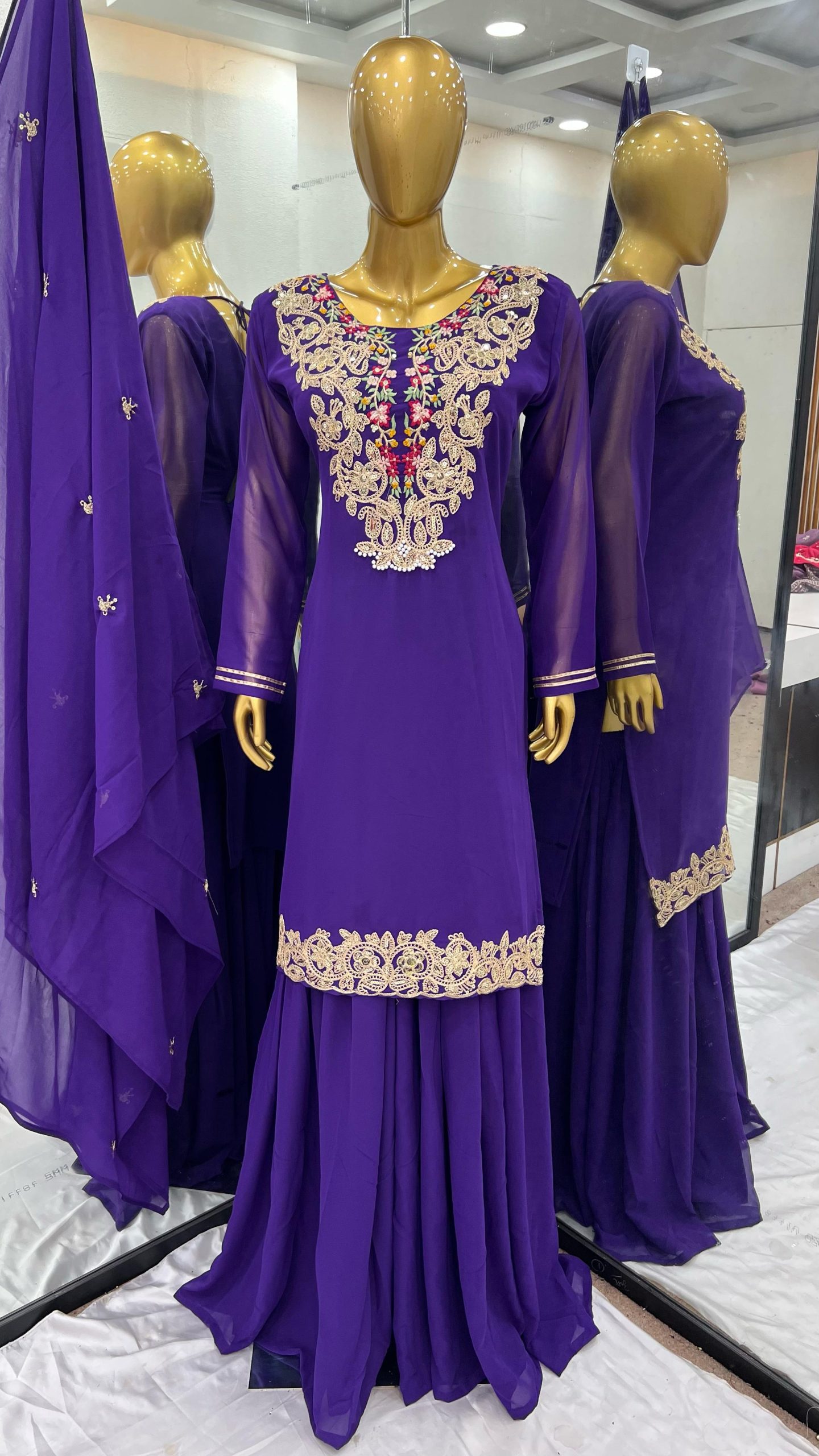 Fabrics | Top Fabric : Heavy Faux Georgette Work : Heavy 5mm Embroidery Sequence Work With Full Sleeve Palazzo Fabrics : Heavy Pure Faux Georgette With 5mm Embroidery Sequence With Fully Flair Palazzo inner : Heavy Micro Cotton fully stitched Palazzo Length : 40-41 Inch Dupatta Work : Heavy Faux Georgette With Embroidery Sequence Work |
