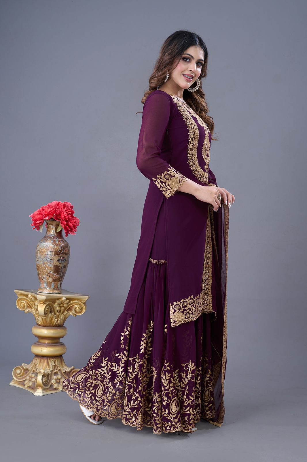 Wine Faux Georgette Embroidery Sequence Work Salwar Suit