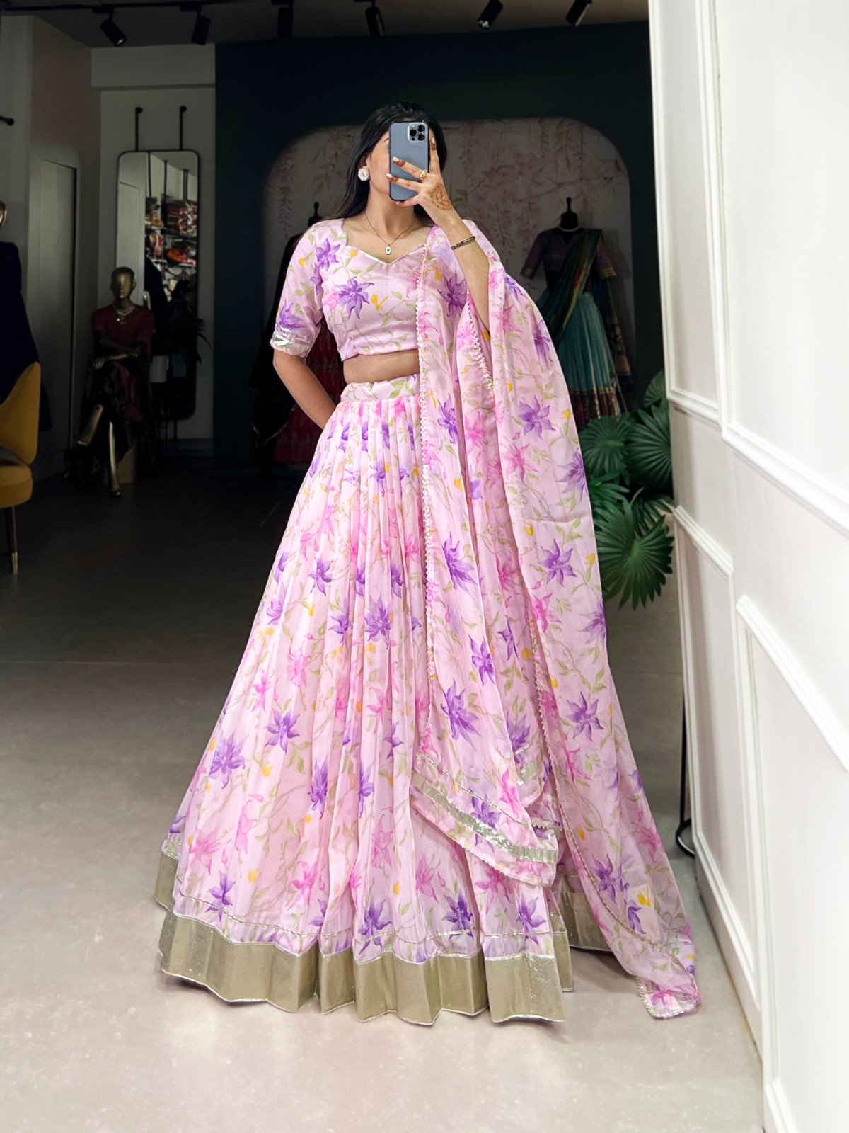 1 Lehenga :: 1 Blouse :: 1 Dupatta :: Drawstring with Zip |