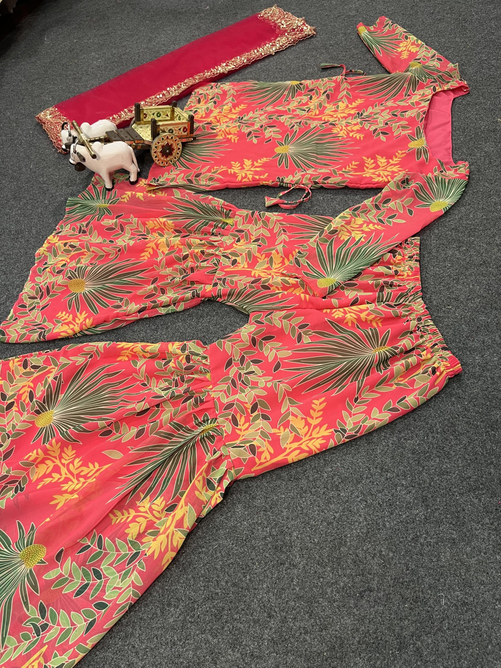 Fabrics | Top Fabric : Silk- Faux Georgette Work : Digital Print Top Inner : Micro Top Size : Free Size Fully Stitched Ready To Wear Top Length : 36-37 Inch Palazzo Fabrics : Faux Georgette Palazzo inner : Micro fully stitched Palazzo Length : 40-41 Inch Dupatta : Butterfly Net Dupatta Work : Embroidery sequins Cut work Dupatta Size : 2.3 Meter |