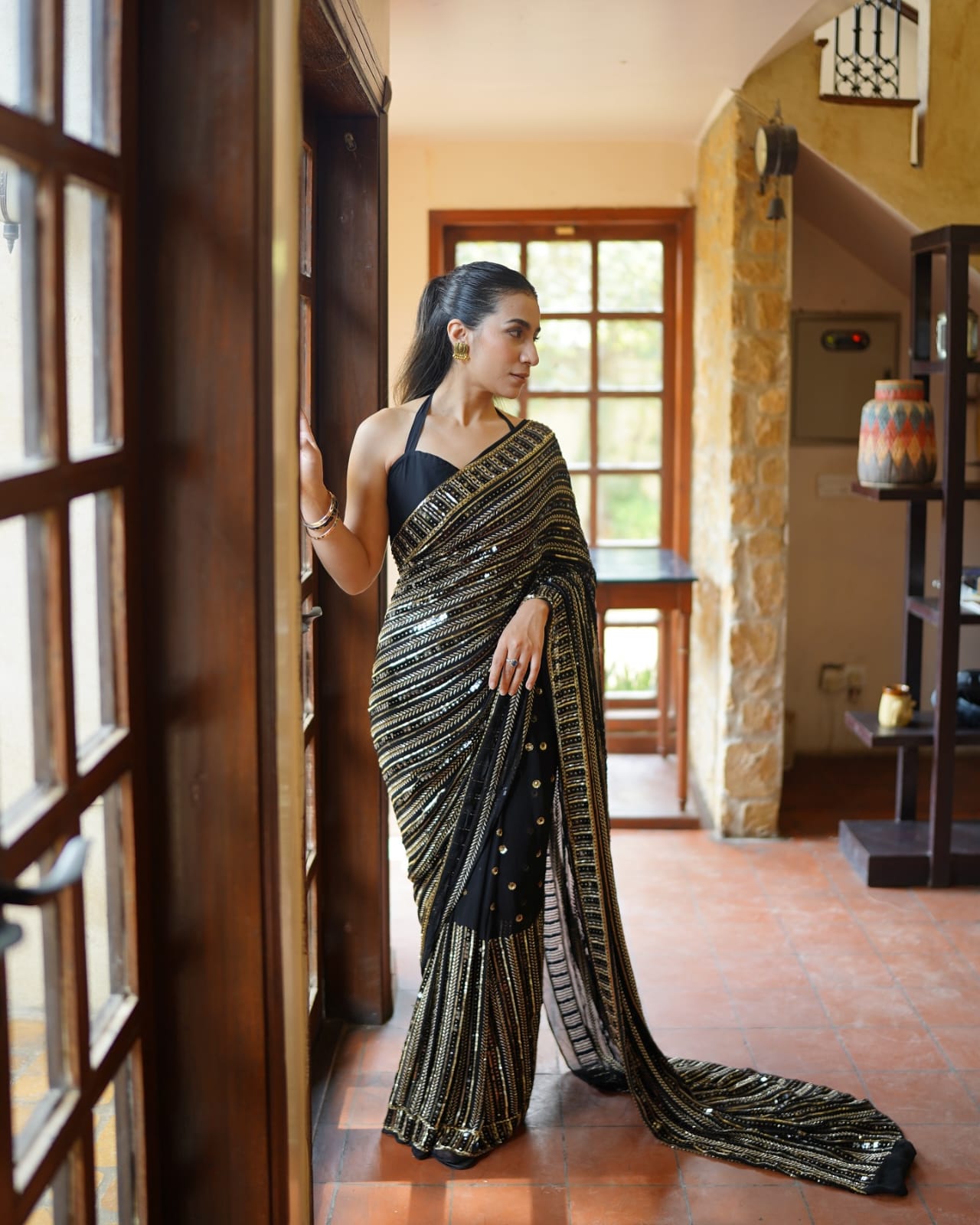 Full Saree Of Heavy Quality Faux Georgette Embroidery Details 5mm Sequins & Multi Embroidery Work Done On Saree 4.4 Mtr Work Done In Saree Blouse-heavy Mono Silk With Embroidery Lace Beautiful Embroidery Sequins Lace Border On Saree |