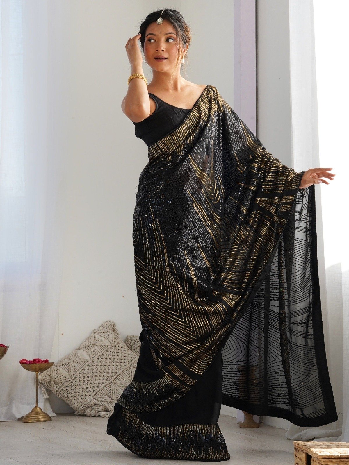 Black Georgette Sequence Lace Work Saree