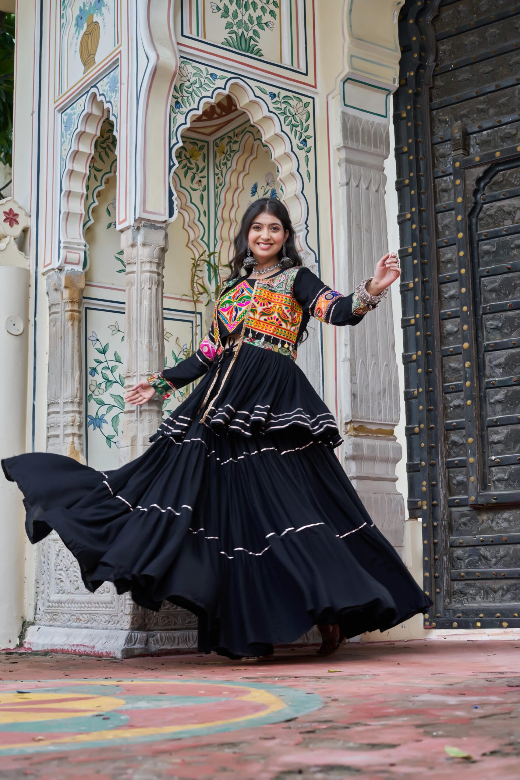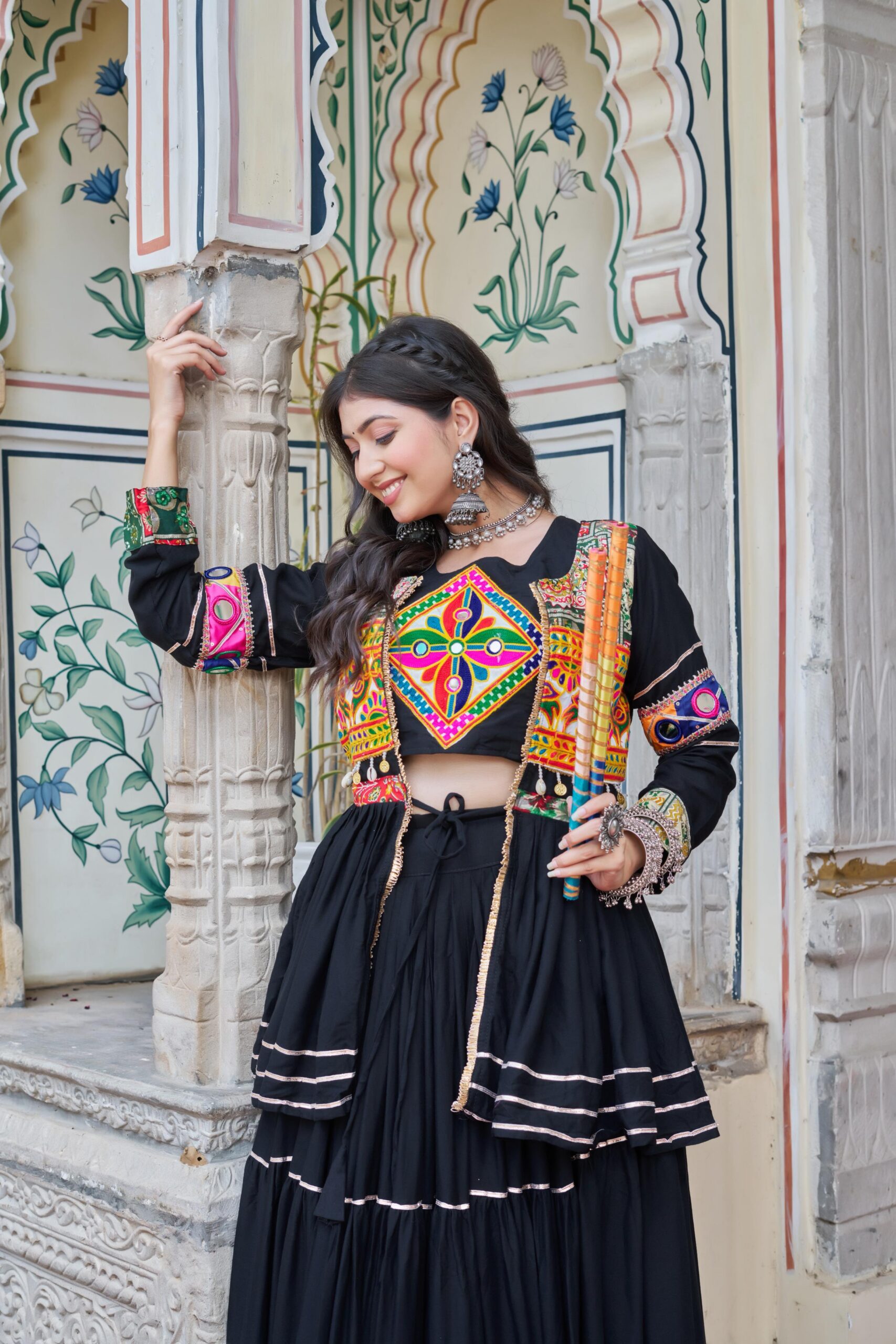 Black Pure Cotton Mirror Gamthi Work Lehenga Choli