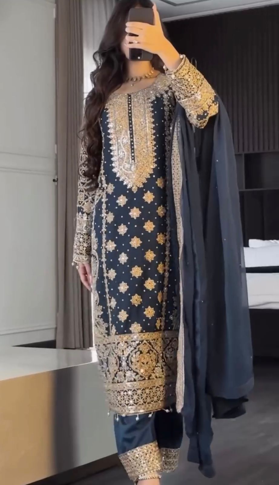 Top Top Fabric : Faux Georgette With Heavy Embroidery Sequence Work And Full Sleeve With Revet Moti Top Inner : Heavy Micro Cotton Top Length : 47-48 inch Top Size. : Free Size Semi Stitched (FULLY STITCHED READY TO WEAR) Pent Pent Fabrics : Faux Georgette With Heavy Embroidery Sequence Work With Elastic (Full stitched) Pent Length : 40-41 Inch (fully stitched) Dupatta Dupatta Fabric: Faux Georgette With Embroidery Sequence Work Lace Border |