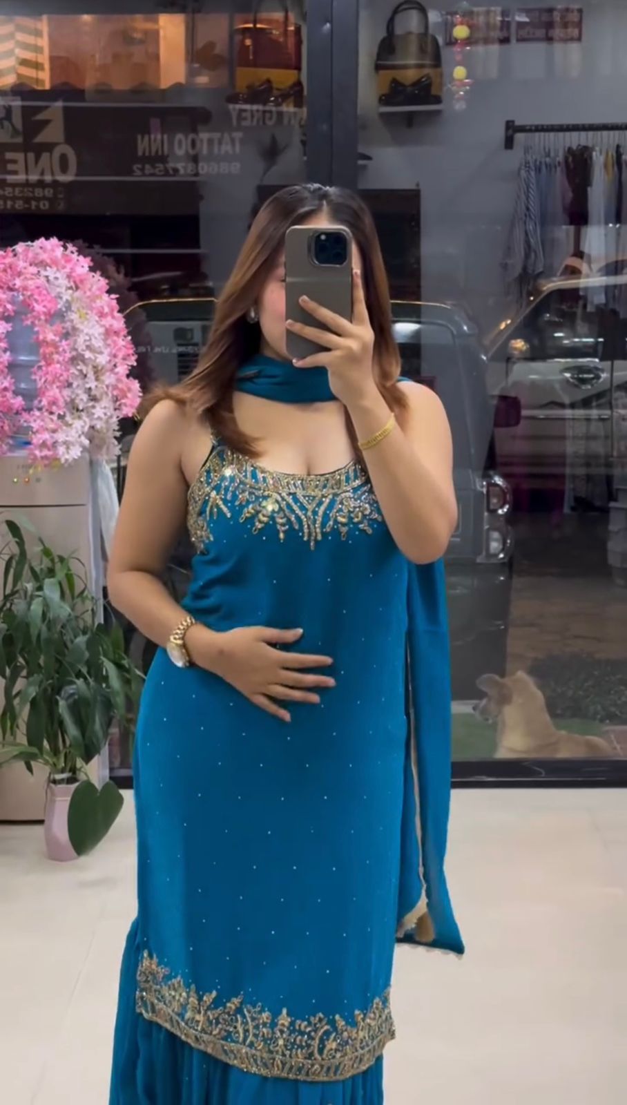 Top Fabric : Faux Georgette Lining : Soft Micro cotton Work : Intricate Beds With Thred & Sequence work Size : Free Size Semi Stitched Sharara Fabric : Faux Georgette Lining : Soft Micro cotton Work : Pearl work Size : Fully Stitched Fits up to Size 44 (Elastic Waistband) Dupatta Fabric : Faux Georgette Work : Fancy Lace Length : 2.10 meters |