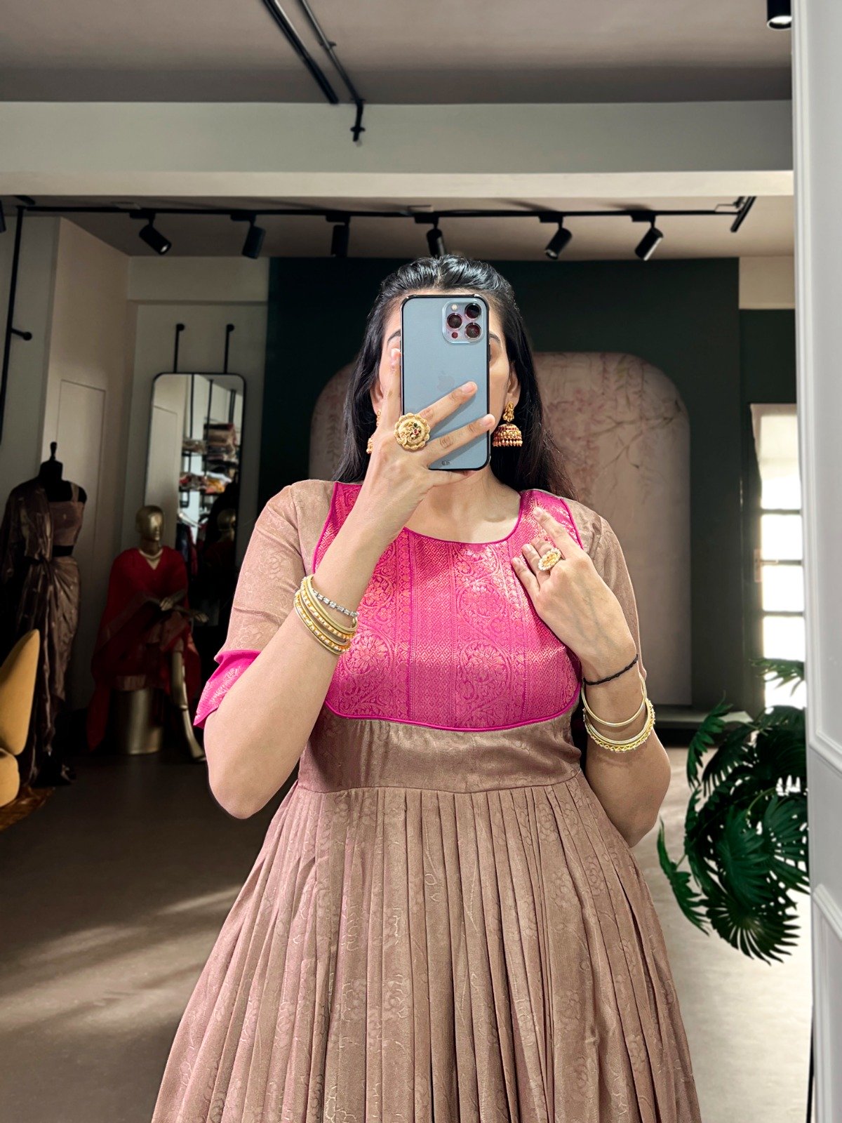 Dress (Stitched) Dress Fabric : Mass Mello Dress Work : Zari Weaving Work Chest : Free Size (Inside 2 inch extra margin available so you can adjust support up to 42 for your body comfort) Waist : 38″ Length : 57″ Sleeve length : 11 Shoulder : 15 Flair : 3.30 Meter Lining : silk (full upto bottom) |