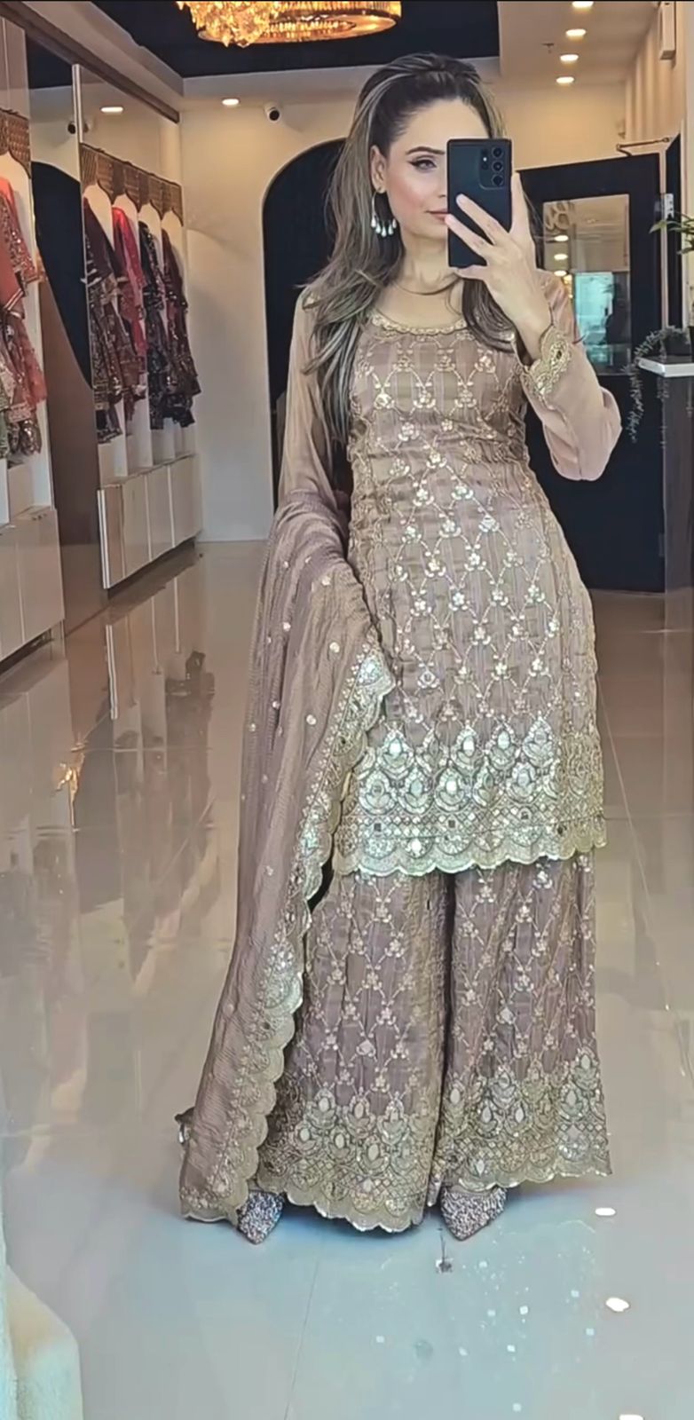 ย Fabrics | Top Fabric :Pure Heavy Chinnon Silk With Heavy Embroidery Sequence Work with Real Mirror Hand Work With Full Sleeve Top Inner : Heavy Micro Cotton Top Size : Free Size Fully Stitched Ready To Wear Top Length : 38-39 Inch Palazzo Fabrics : Pure Heavy Chinnon Silk With Embroidery Sequence Work With Real Mirror Hand Work Full stitched Pent Length:40-41 Inch Dupatta :Pure Heavy Chinnon Silk With Embroidery Sequence Work With Real Mirror Hand Work And Four Side Lace Border Dupatta Length: 2.10 MTR |