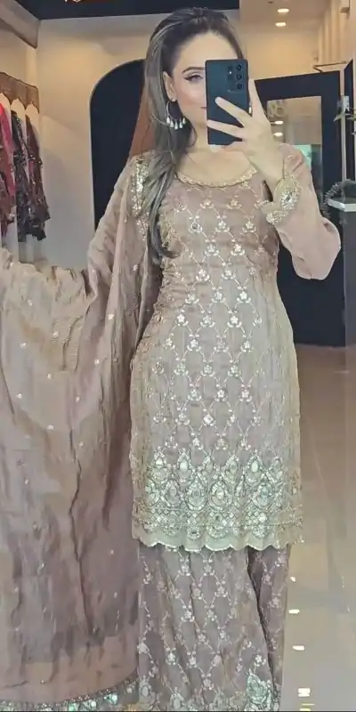 111 reviews for Cream Chinnon Silk Embroidery Sequence Work Real Mirror Hand Work Salwar Suit