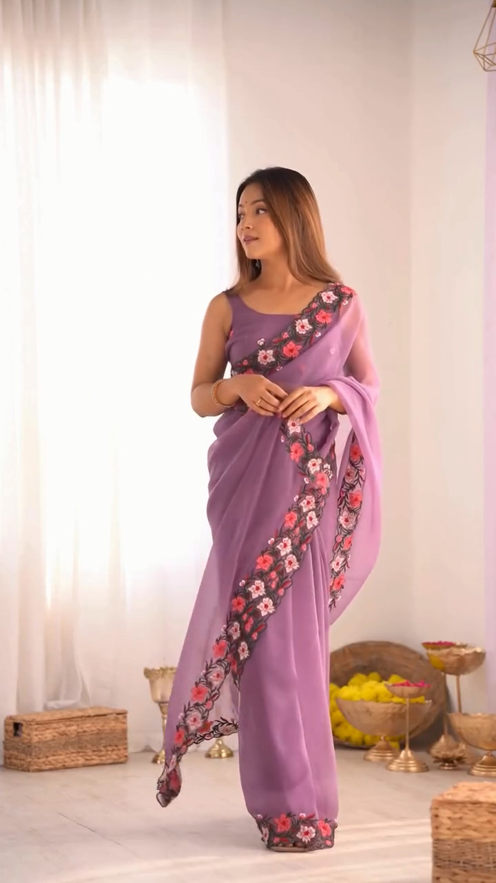 Classic Purple Color Georgette Pastel Embroidery Multi Work Saree