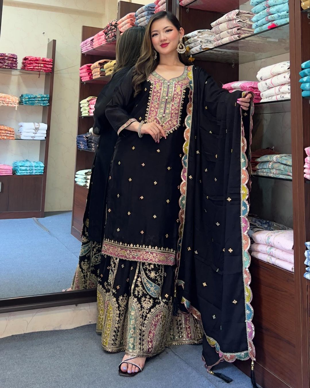 InnerΒ :Heavy Micro CottonΒ LengthΒ Β Β Β : 40-41 Sharara Fabrics : Heavy Chinon Silk With *Malty Thread Embroidery Sequence Work With Flair Sharara Length:40-41 Inch (fully stitched) Dupatta Fabric * :Heavy Chinon Silk With *Malty Thread Embroidery Sequence Work and Lace Border |