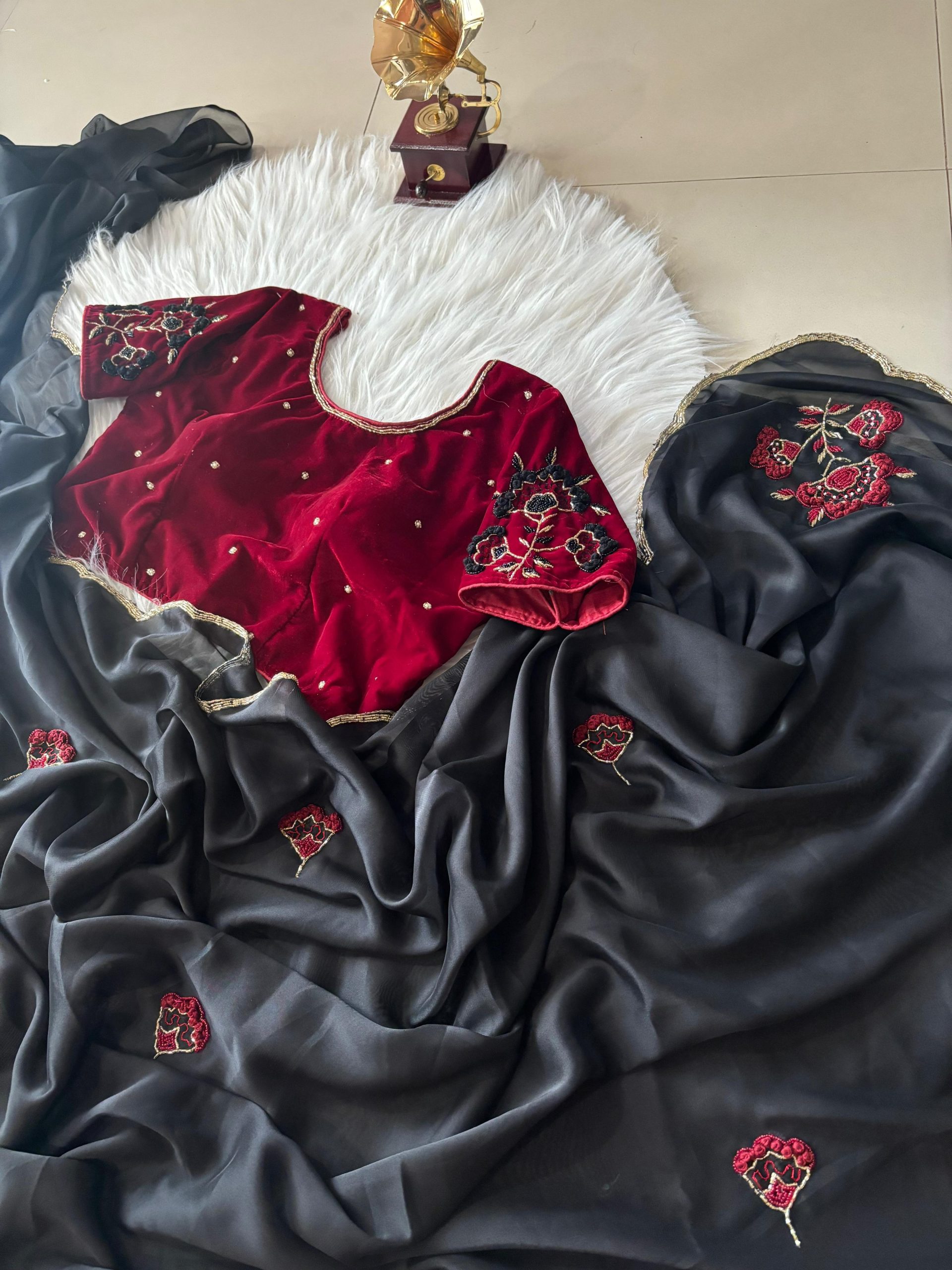 Velvet 9000 Designer Blouse Having 2 Butta Saree Work : Cover With Three Layer Cut Dana Border And Double Layer Arco Border Having Butta All Over Saree Run With Cut Dana, Moti And Resham Thread