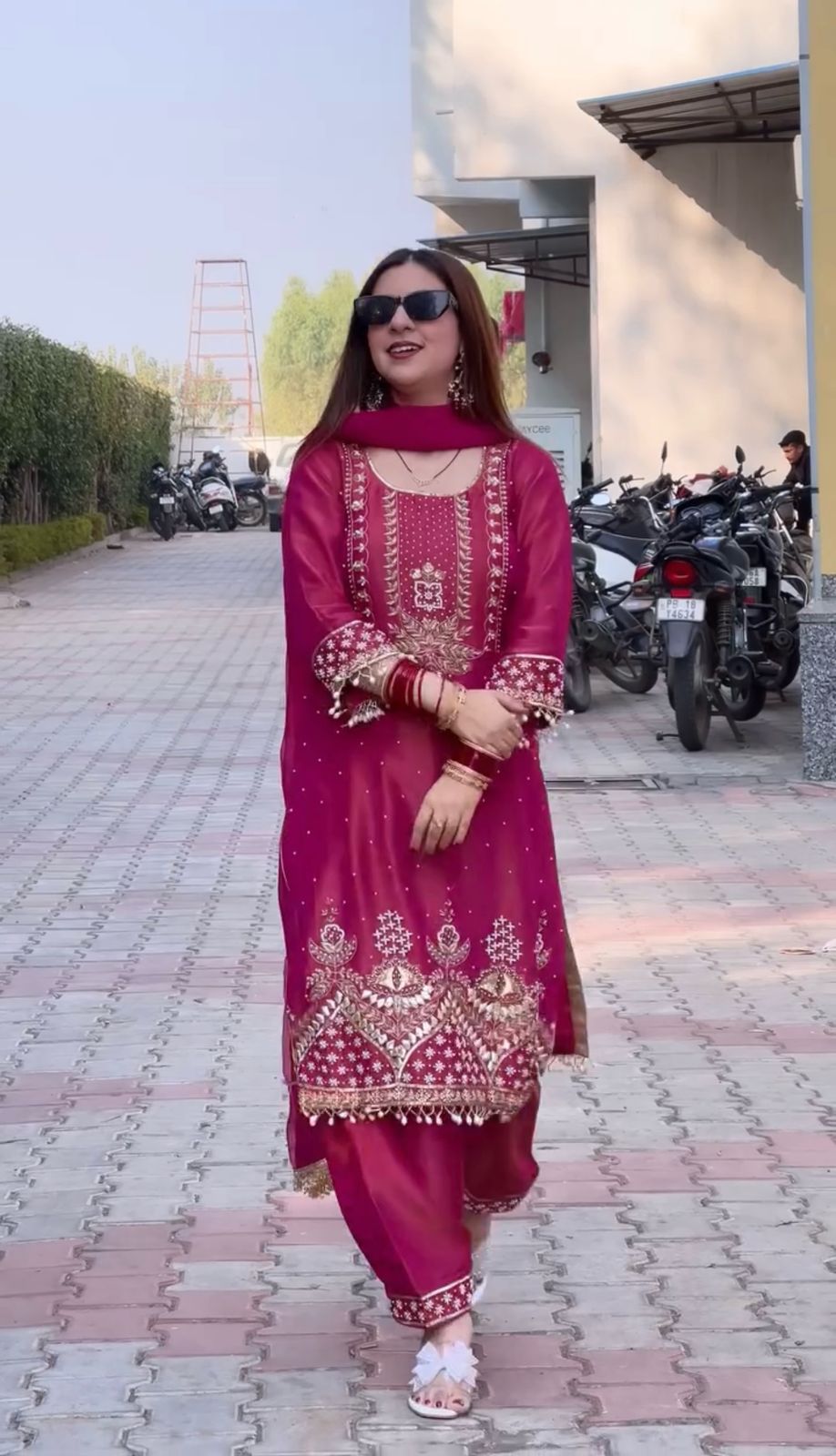 117 reviews for Red Roman Shimmer Silk Embroidery Sequences Work Peral Moti Salwar Suit