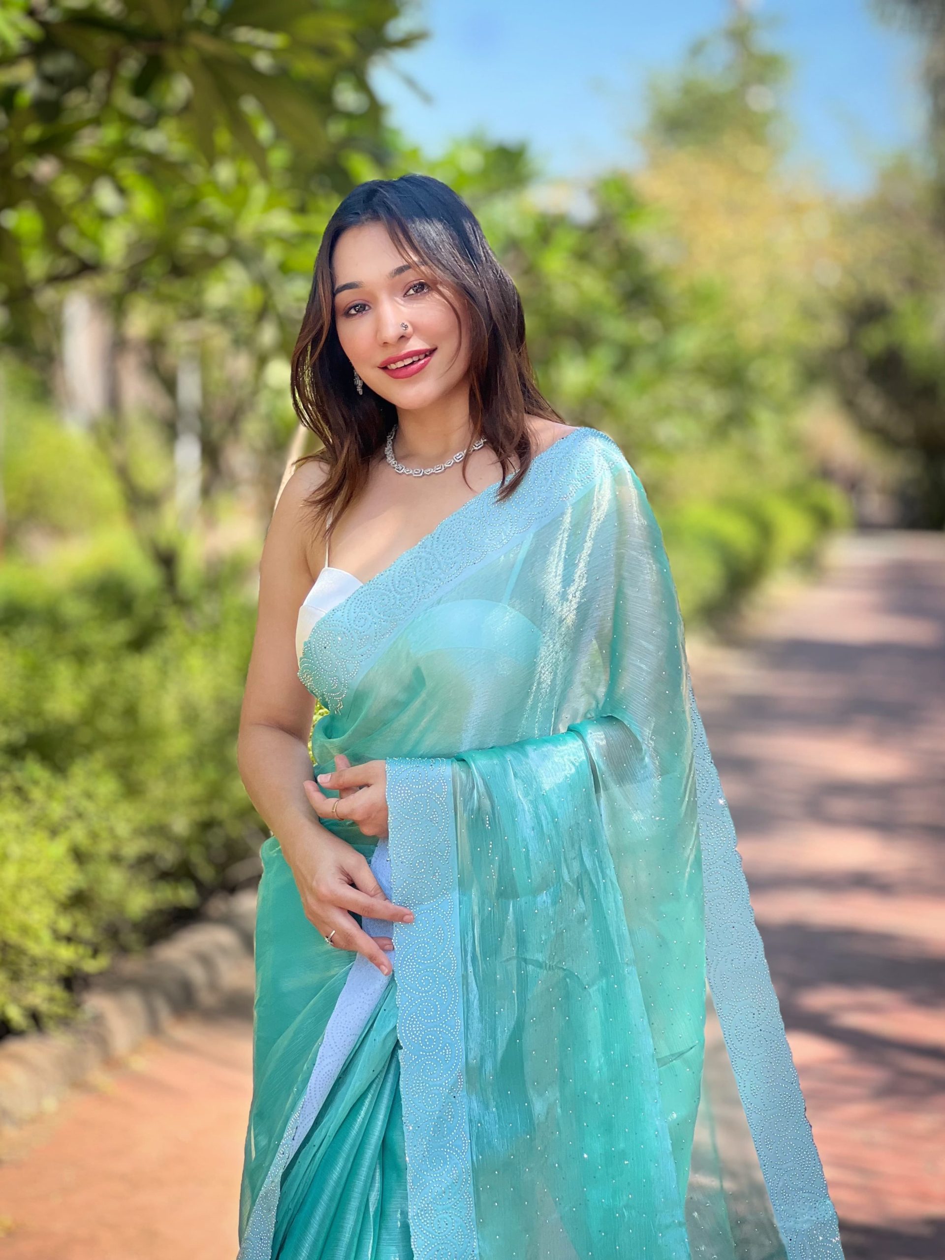 Fancy Sea Green Color Burberry Silk Diamond Sequins Saree