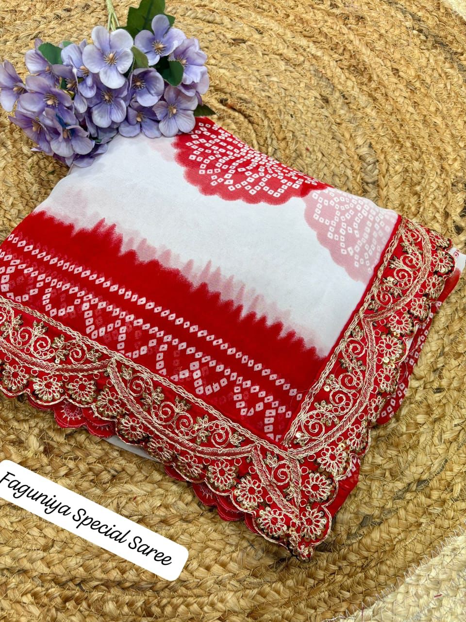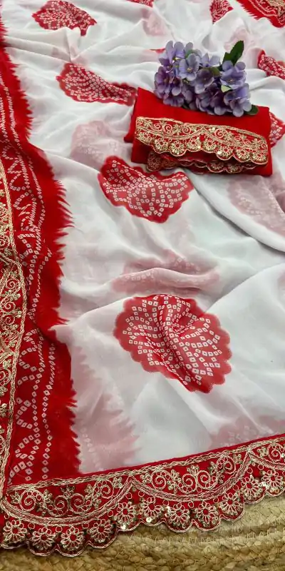 Fabrics | Saree : Georgette work : Red & White With Codding Sequence Cutwork Lace Border On Sarees Along With Banglori Blouse with embroidery lace Blouse : Mono BangloriSaree cut : 5.50+ meter Blouse : 0.80 Meter |