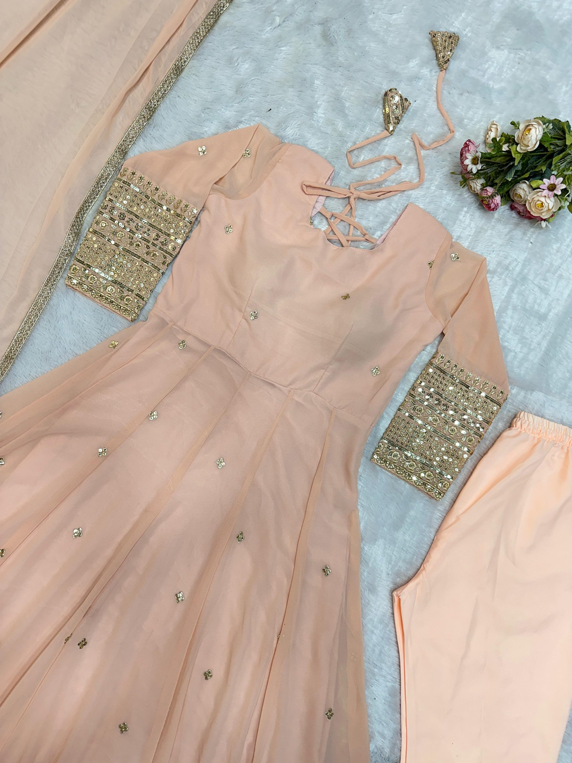 ย Fabrics | Gown Fabric : heavy Fox Georgette With Embroidery Work With Full Sleeves And Work Gown Inner : Micro Cotton Gown Size : Free Size Sami stitched Gown Length : 51-inc Gown Flair : 4.5 Mtr Fully StitchedBottom Fabric : heavy Micro Cotton And Elastic Full-stitched To Dupatta Fabric : heavy Fox Georgette And Four Side Lace Work Dupatta Length: 2.10 Mtr |