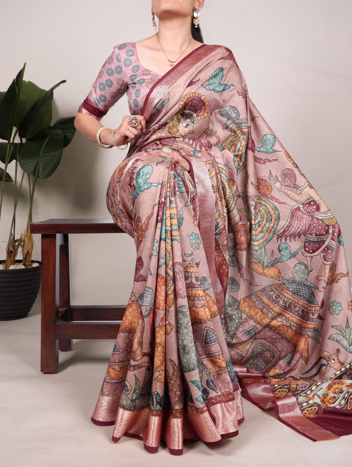 Fabrics | Saree Fabric : Tussah Silk With Viscose Border Saree Work : Printed Saree Length : 5.5 meterBlouse (Unstitched) Blouse Fabric : Tushar Silk With Viscose Border Blouse Work : Printed Blouse Length : 0.80 meter |