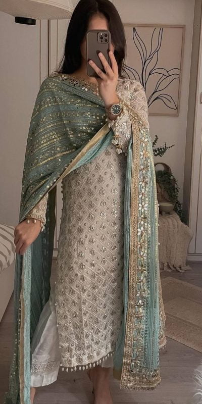 The embellished work on the upper part is beautiful and the overall pattern with the sleeves makes the outfit more gorgeous