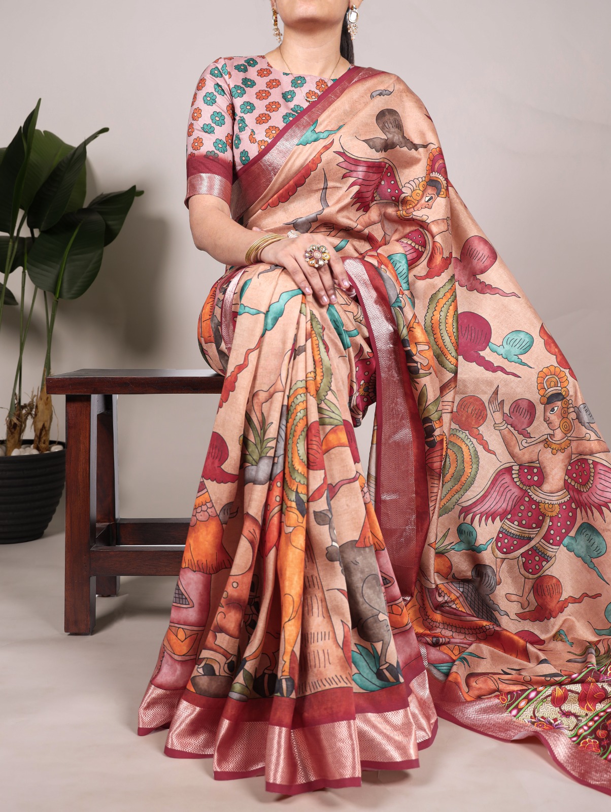 Fabrics | Saree Fabric : Tussah Silk With Viscose Border Saree Work : Printed Saree Length : 5.5 meterBlouse (Unstitched) Blouse Fabric : Tushar Silk With Viscose Border Blouse Work : Printed Blouse Length : 0.80 meter |