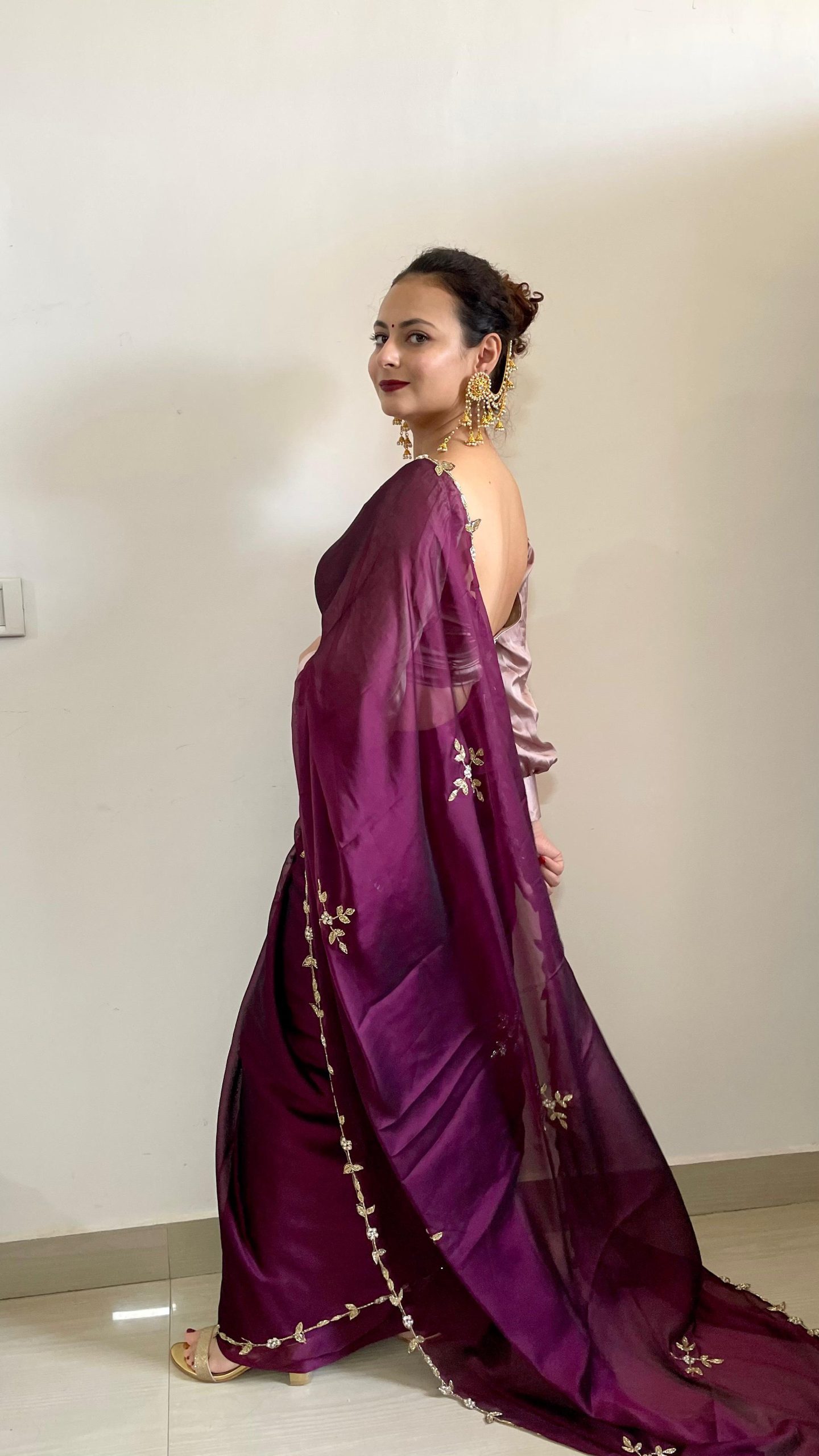 Wine Rangoli Silk Handwork Cutwork Pearl Saree