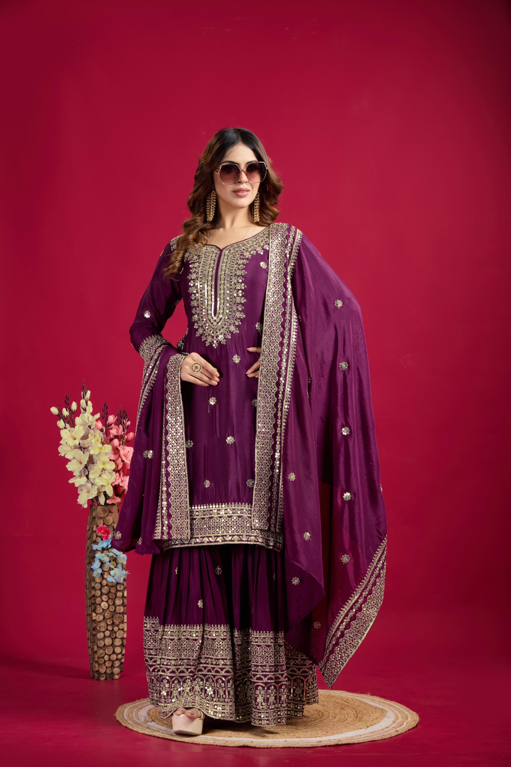 Fabrics | Top :- :Pure Heavy Chinnon Silk With Embroidery And 5mm Sequence Work Sleeves :- Chinnon Silk With Embroidery And 5mm Sequence Work With Full Sleeves Dupatta :-:Pure Heavy Chinnon With Four Side Lace BorderSharara inner :Heavy Micro CottonSharara Palazzo Fabrics: Pure Heavy Chinnon Silk With 5mm Embroidery Sequence Work With Fully Flair Top Inner :-Heavy Micro Cotton Top Length :- 36-37Inch Size:- Free Size Semi Stitched |