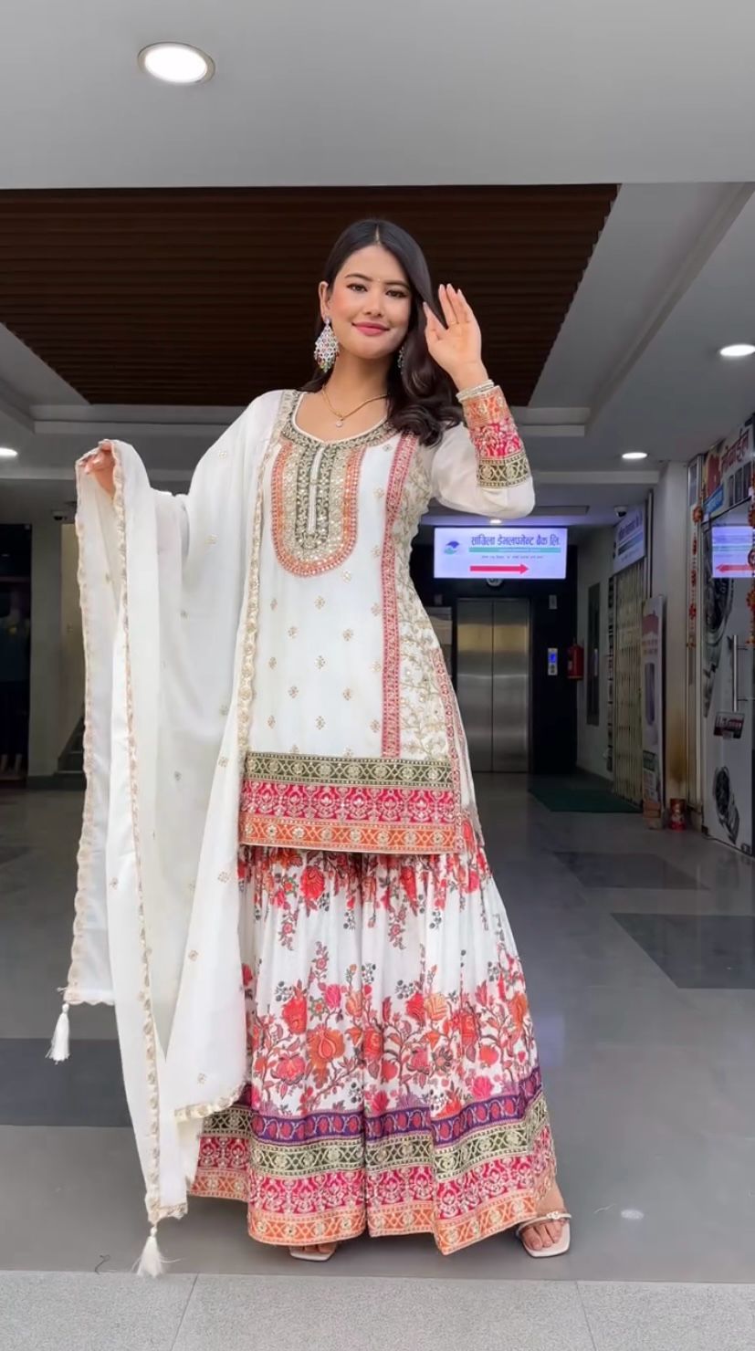 Fabrics | Top Fabrics : Heavy Foix Georgette Top Work : Embroidery Sequences Work Top Size : Full Stitched Free Size Semi Stitched Top Length : 40 InchedPalazzo Fabrics: Heavy Foix Georgette Palazzo Work: Digital Print With Embroidered Sequences Work Palazzo Length : 39 Inched Palazzo Size : Full Stitched ( Free Size ) Dupatta :heavy Foix Georgette Dupatta Work : Full Embroidered Sequence Work Dupatta Size : 2.10-2.20 Mtr |