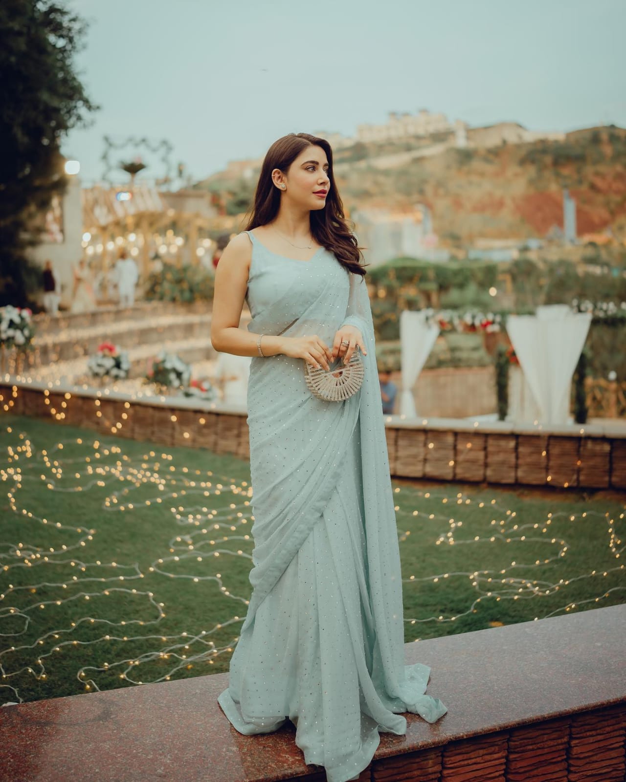 Grand Light Blue Color Georgette Sirvoski Support Lace Saree