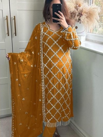 Mustard Georgette Embroidered Hand Work Salwar Suit