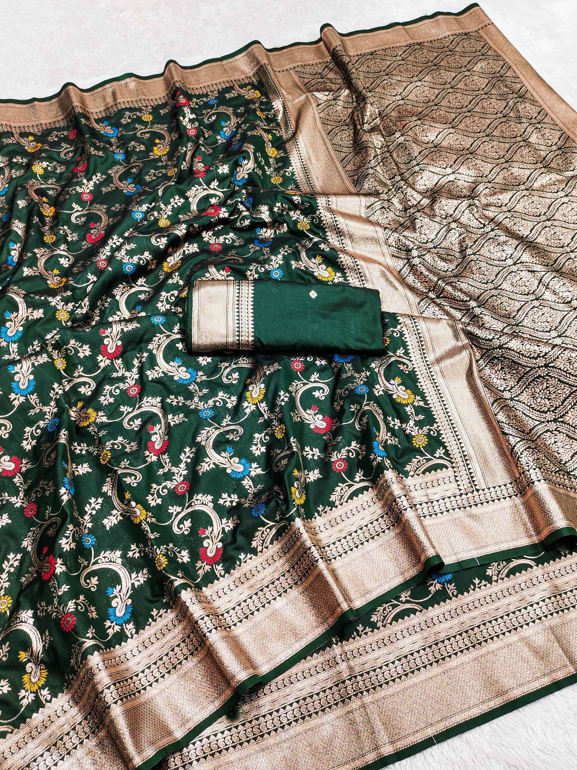 Saree :- Soft Banarasi silk with design all over the & Meenakari weaving Rich pallu with Meenakari weaving Rich border.