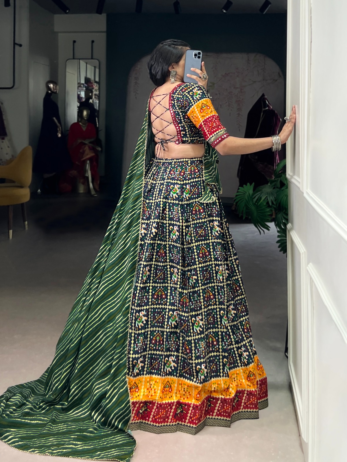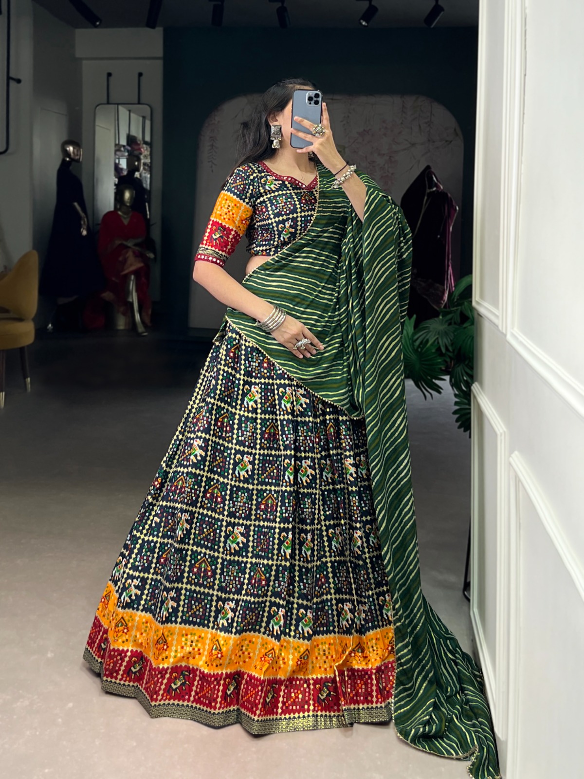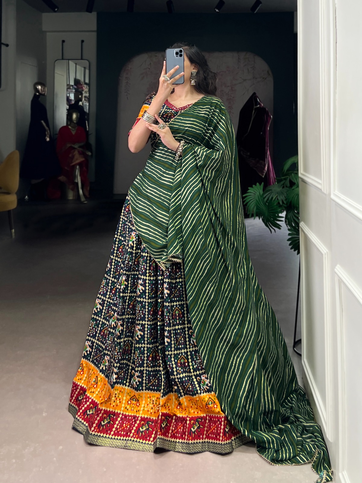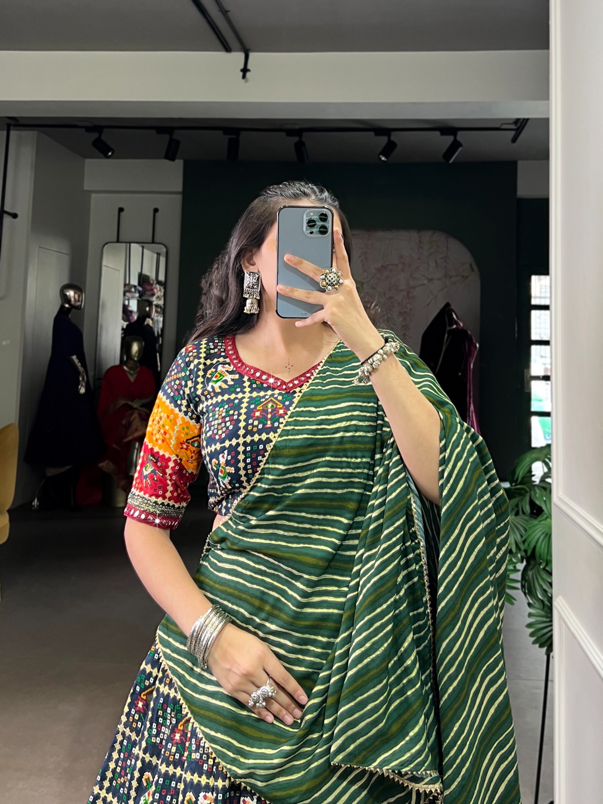 Lehenga (Stitched) Lehenga Fabric : Cotton Lehenga Work : Printed With Foil Work Waist : SUPPORTED UP TO 42 Stitching : Stitched With Canvas Lehenga Closer : Drawstring and Heavy Hand made Tassels Length : 41 Flair : 3.30 Meter Inner : Micro Cotton Blouse (Stitched) Blouse fabric : Cotton Blouse Work : Printed With Foil Work Blouse Length : 1 Meter Dupatta Dupatta Fabric : Rayon Dupatta work : Foil Printed With Paper Mirror And Gota Patti Lace Border Also Come With Tassels Dupatta Length : 2.40 Meter |