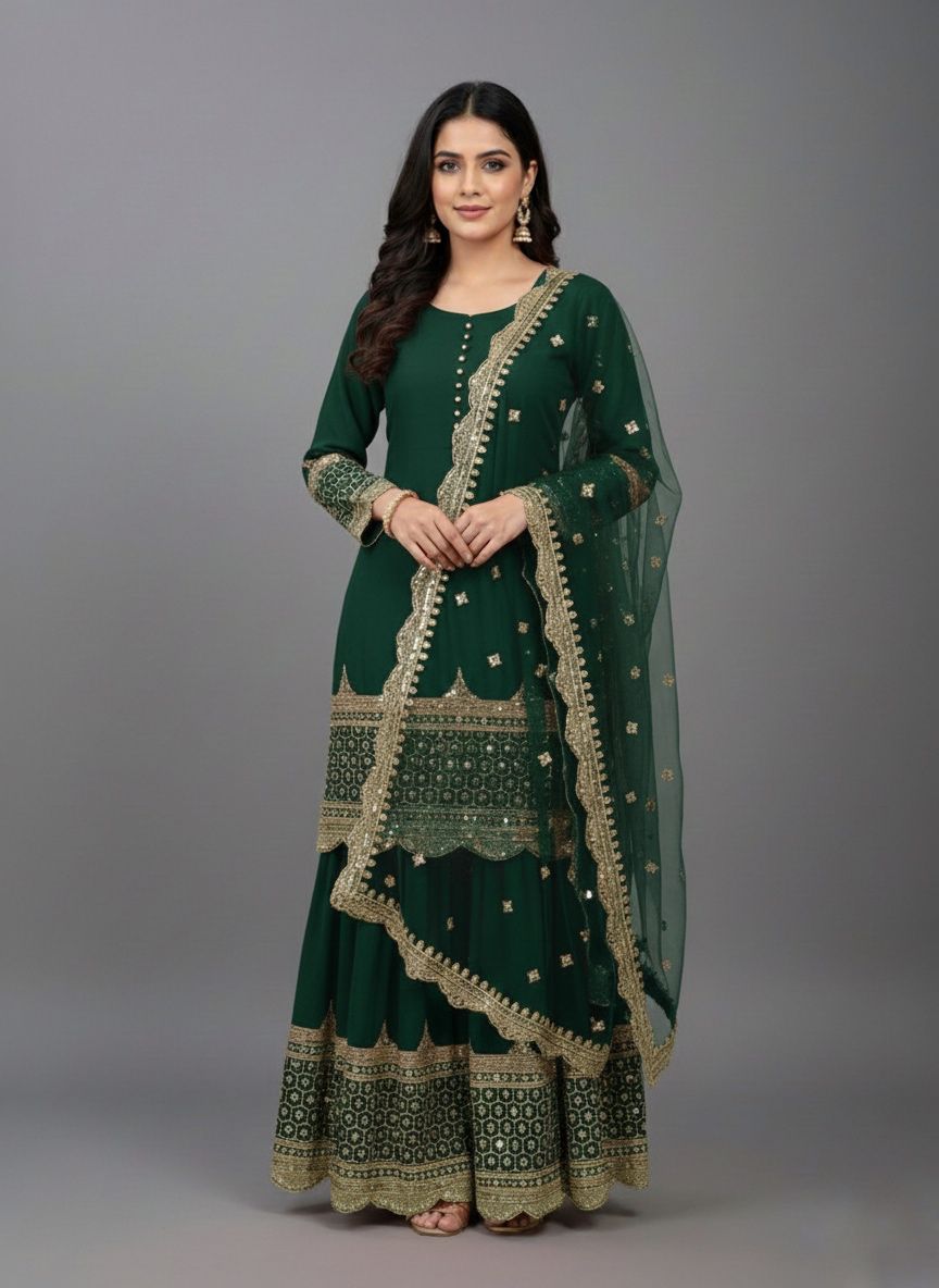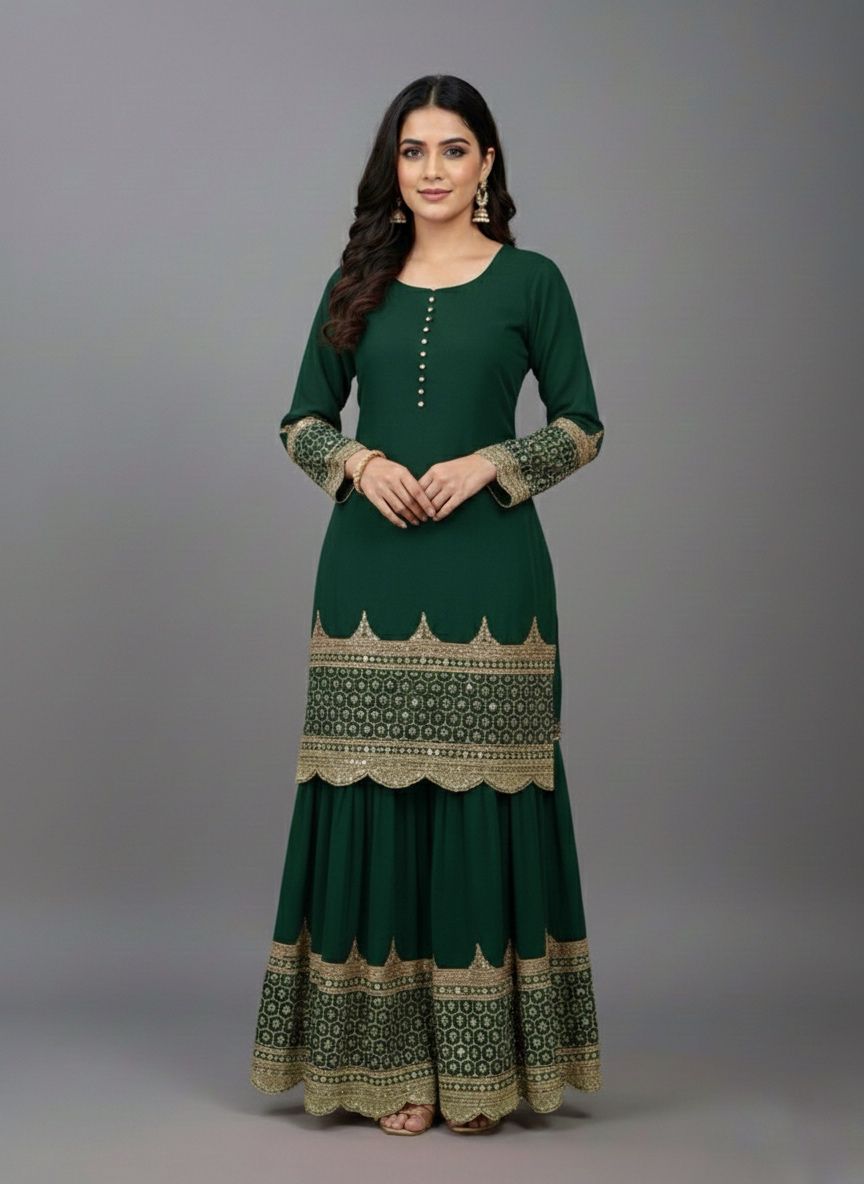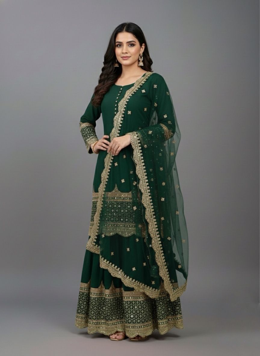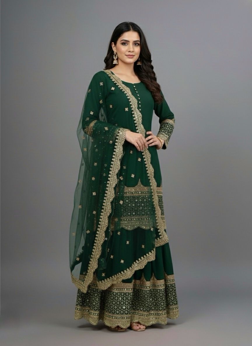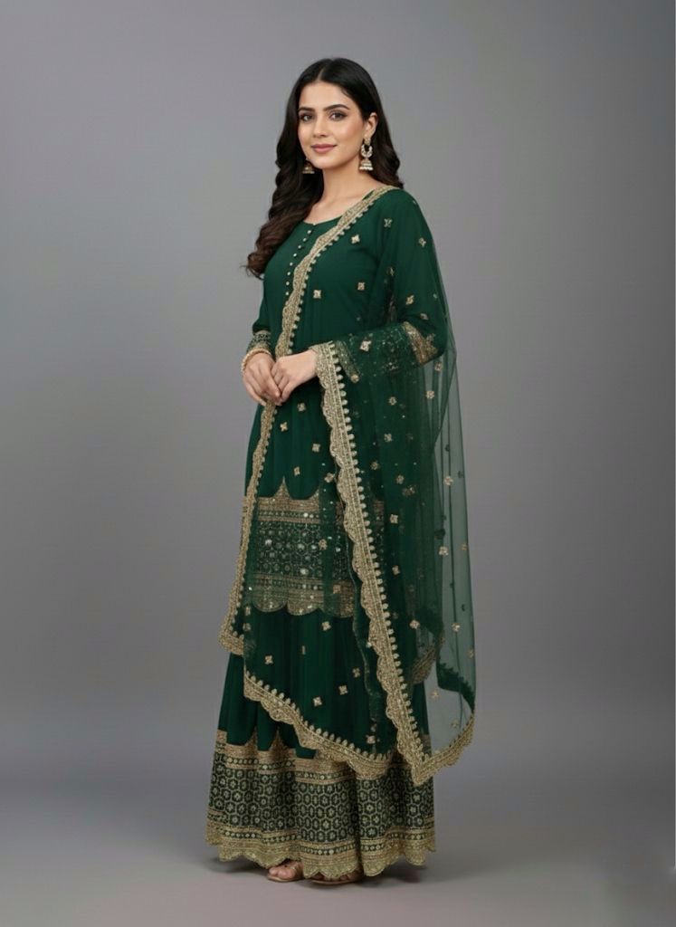 Top : Heavy Faux Georgette With Heavy 5mm Embroidery Sequence Work With Full Sleeve and Potli Button Inner : Heavy Micro cotton Length : 37-38 Inch Size : Free Size Work :Embroidery Sequence Work Type : Semi Stitched Palazzo :Heavy Faux Georgette With 5mm Embroidery Sequence Work With Fully Flair Palazzo inner :Heavy Micro Cotton Palazzo Length:40-41 InchDupatta : Heavy Net With 5mm Embroidery Sequence Work and Lace Border |