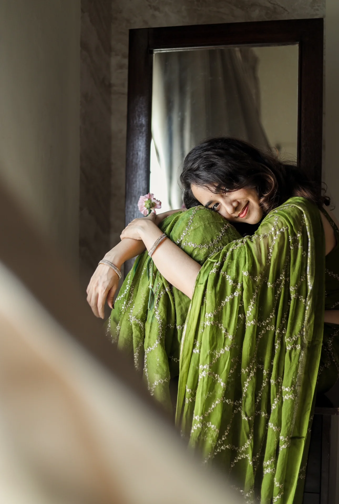 2. Loved the bold floral crepe Indian saree; Sunday family lunch me cheerful vibe, low maintenance, stain bhi easily nikal gaye.