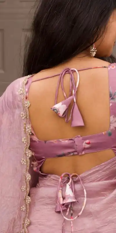 Saree work : Heavy Handwork On Border With Cut Dana Moti And Jardoshi. Blouse Fabric : Georgette Satin With Blouse work : Digital Flower Print Have Front And Sleeves Handwork. Un – Stitched Blouse |
