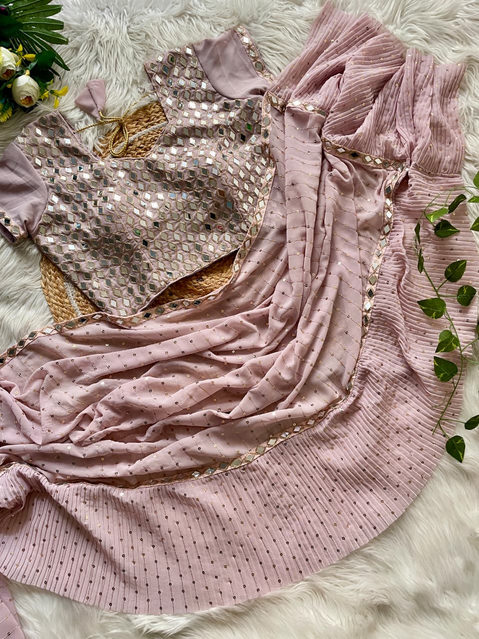 Saree Details Saree Fabric Faux Georgette With Heavy 5mm Sequins Embroidery Work In Saree Crush Pleated With 5mm Sequins Work In Saree Stich Blouse Details Faux Georgette Blouse With Heavy Embroidery Coading Work Front & Back Work Blouse Size-40+margin Original Mirror Work In Blouse Coding Embroidery Lace Border With Original Mirror |