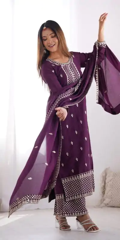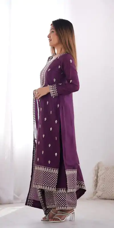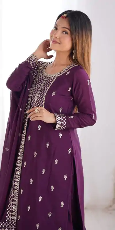 110 reviews for Wine Chinon Silk Embroidery Jari Work Salwar Suit