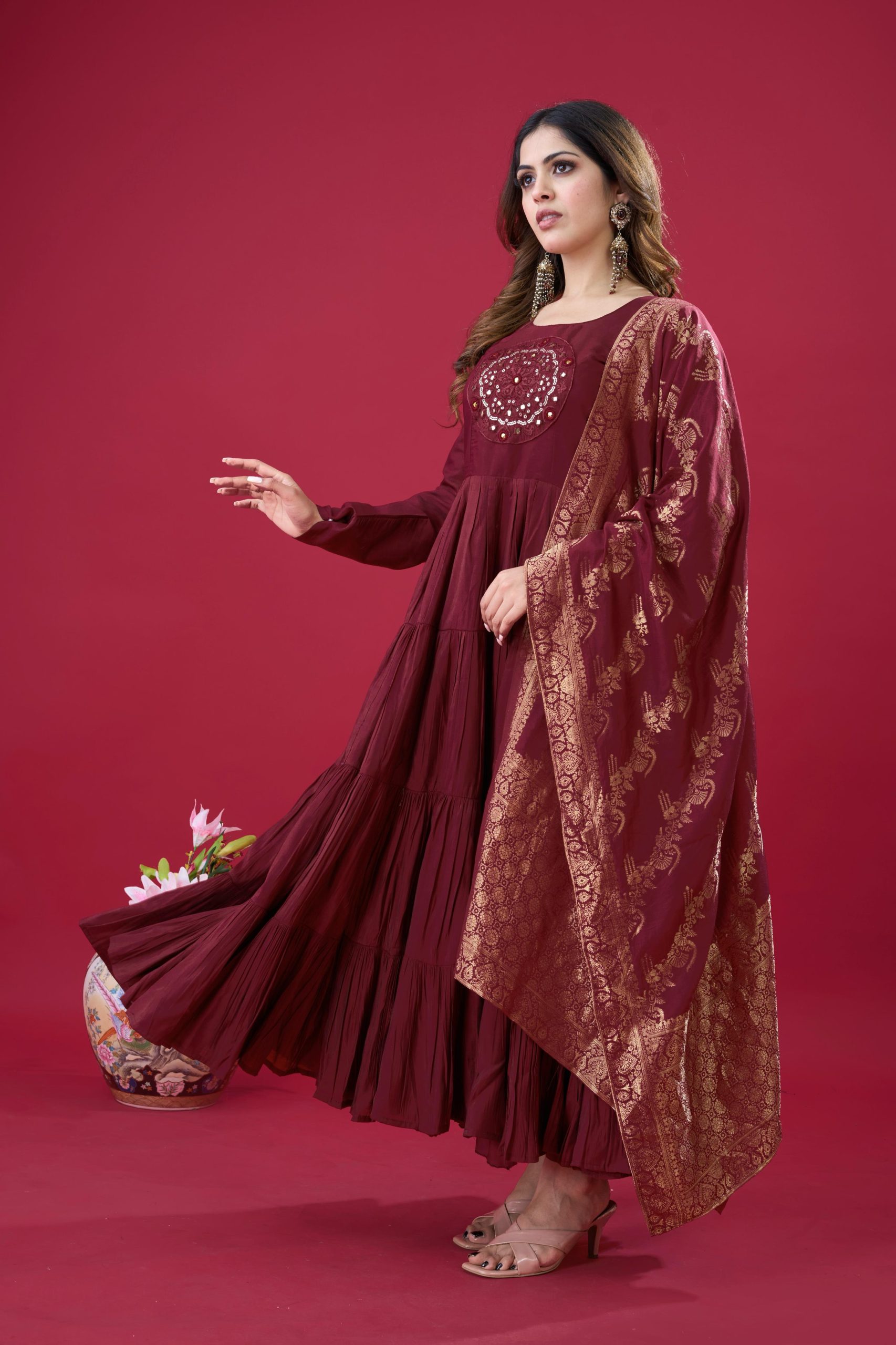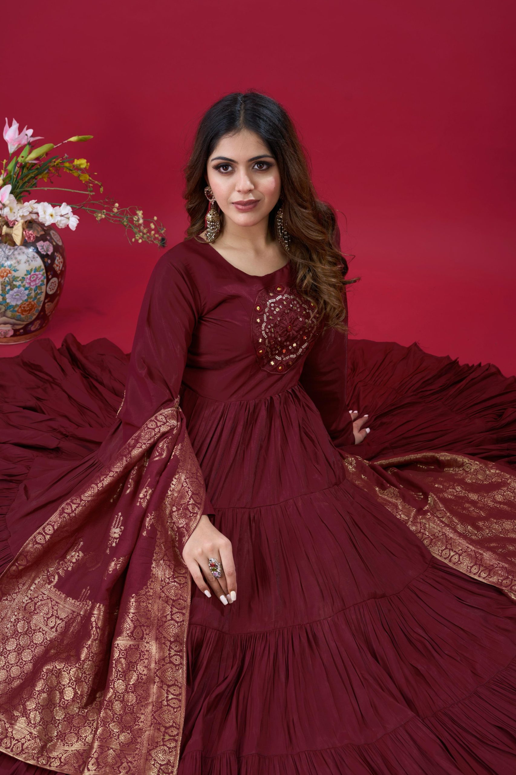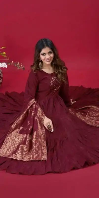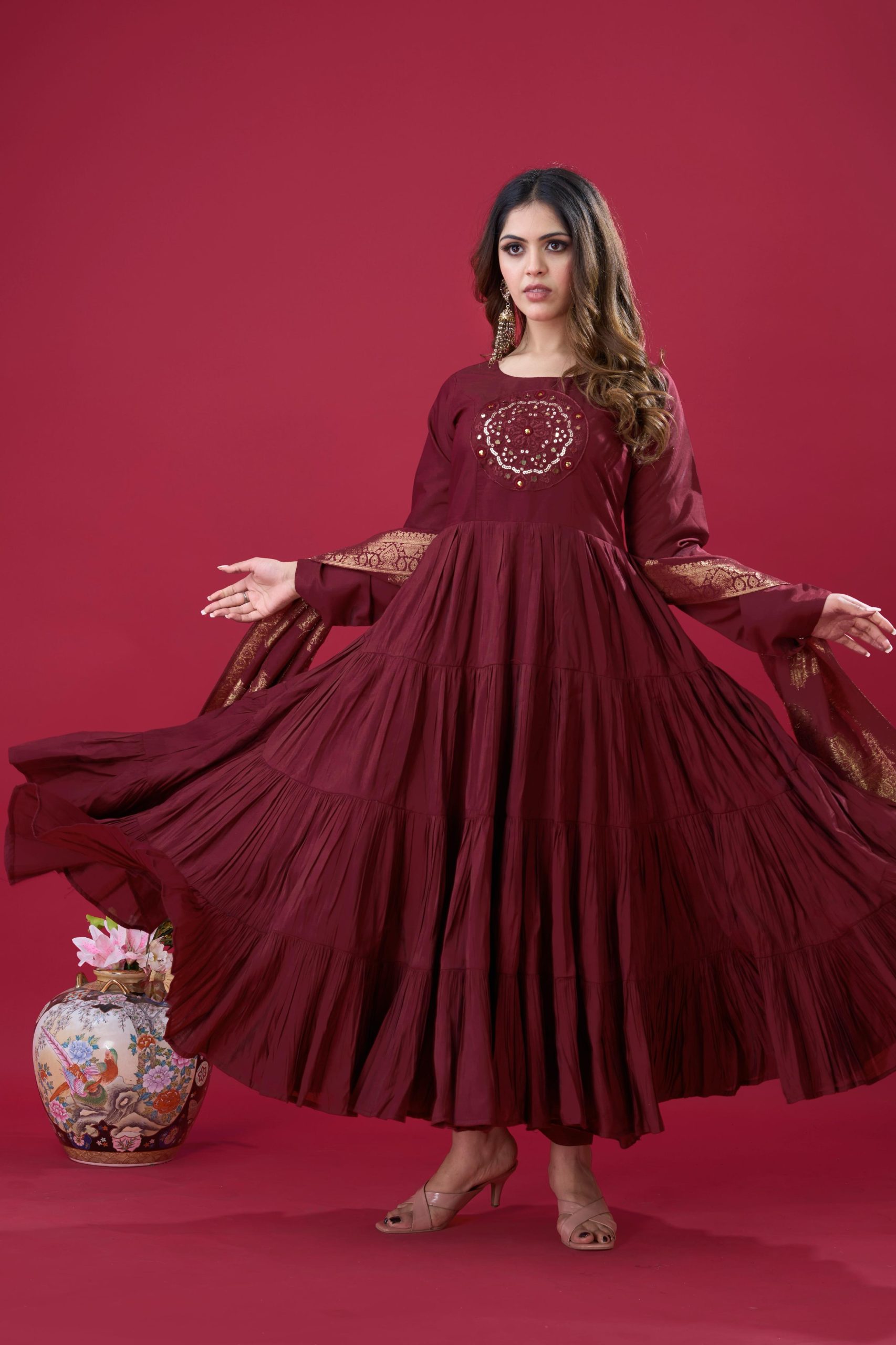 71 reviews for Maroon Roman Silk With Embroidery Sequence Work Anarkali Gown