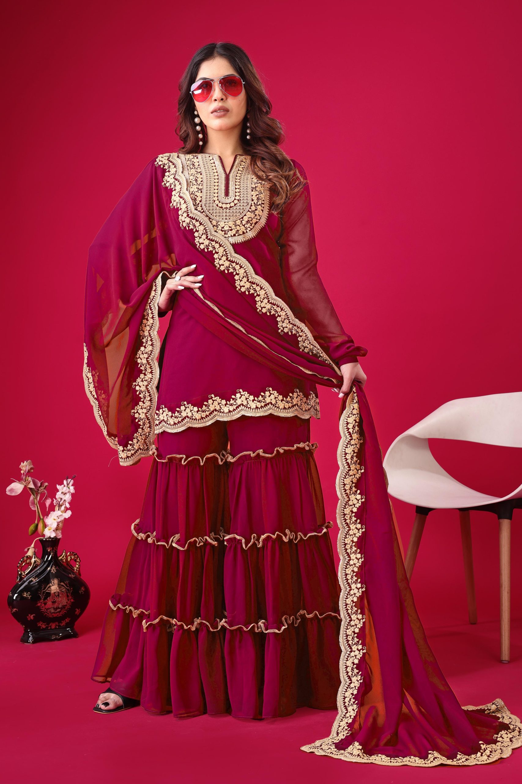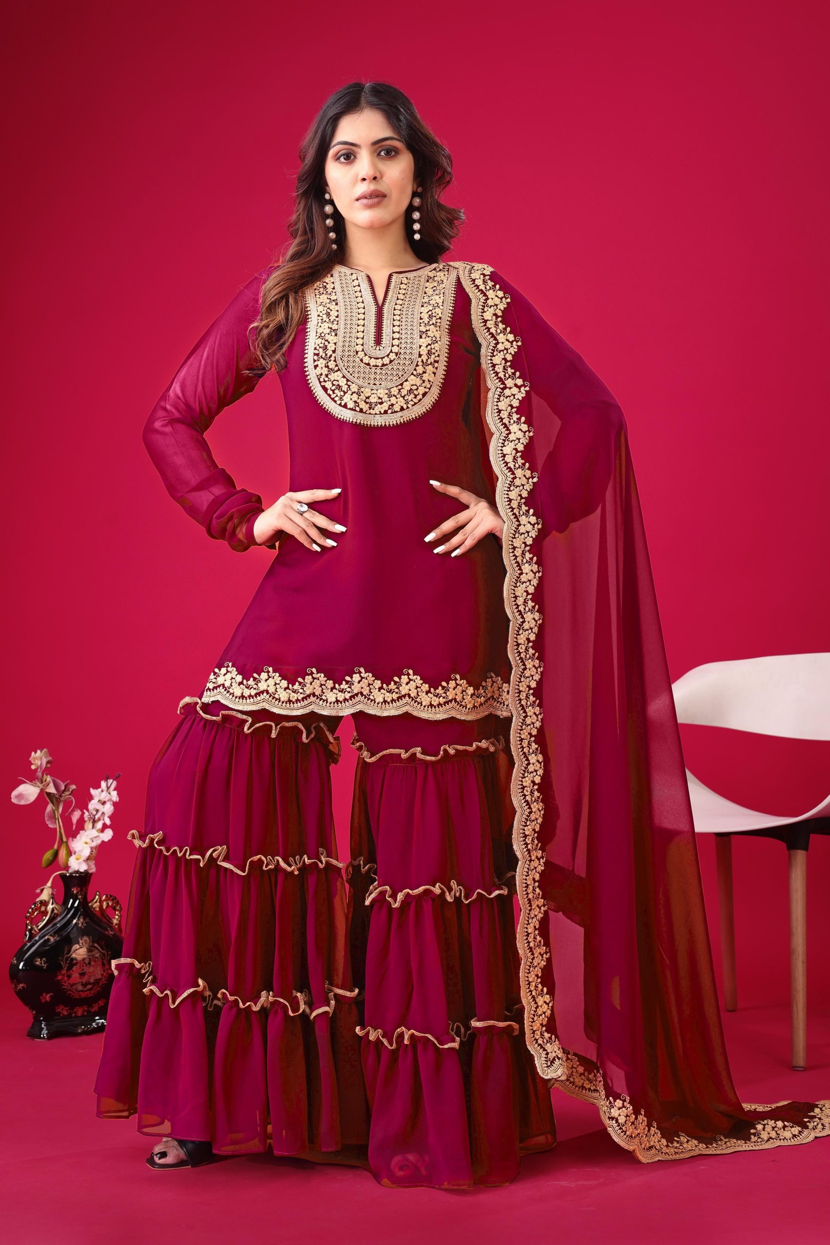 ย  Fabrics Top Fabric :Blooming Faux Georgette With Heavy Embroidery 3mm Sequence Thread Work With Full Sleeve Top Inner : Heavy Micro Cotton Top Size : Free Size Fully Stitched Ready To Wear Top Length : 31-32 inchPalazzo Fabrics : Blooming Faux Georgette With Elastic Full stitched Palazzo inner : Heavy Micro Cottonย ย Length: 40-41 Inch fully stitched Dupatta Fabric : Blooming Faux Georgette With Embroidery 3mm Sequence Work With Lace Border