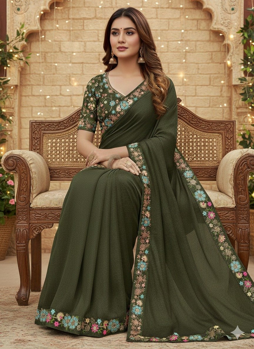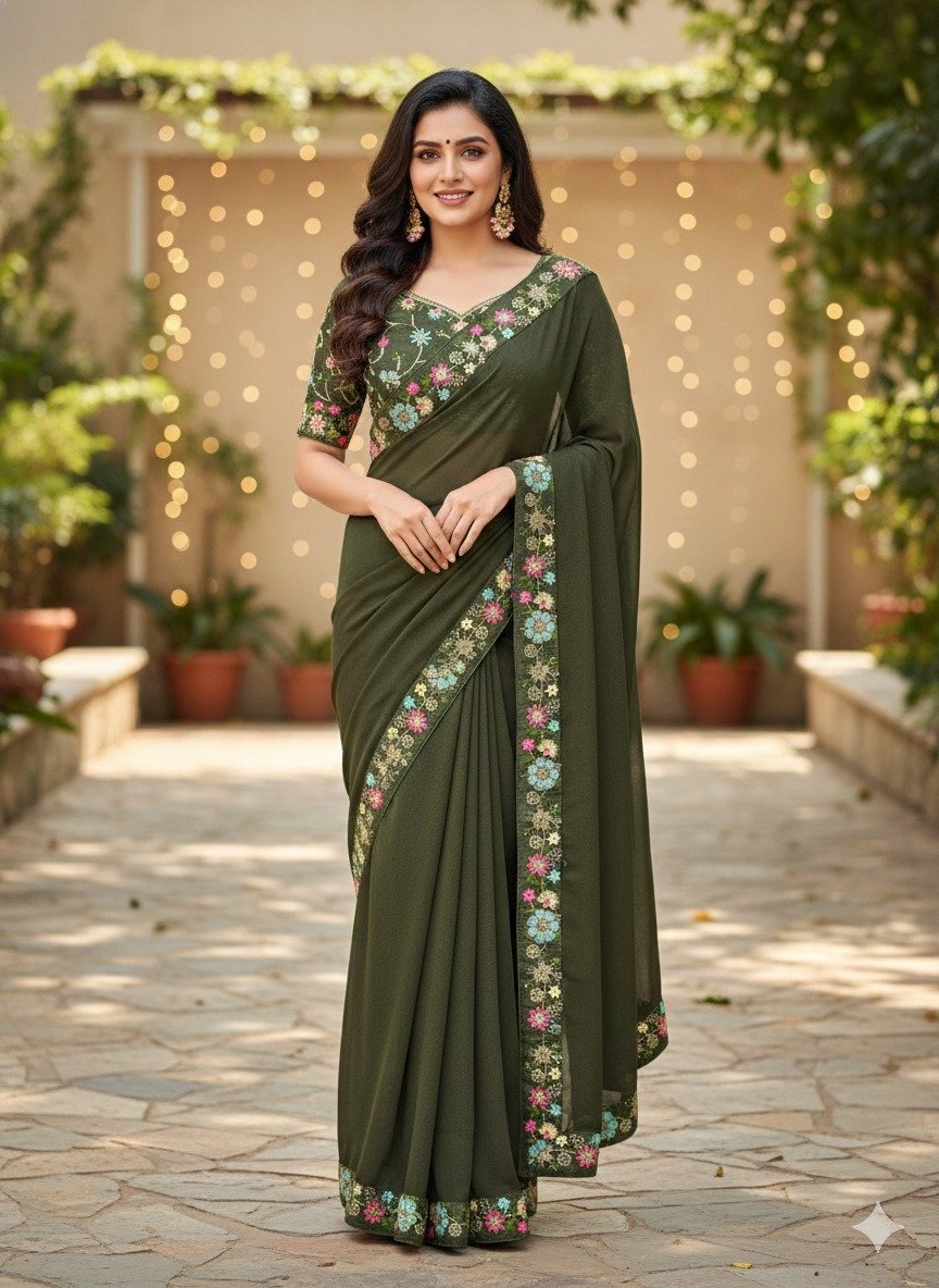 Mahendi Star Georgette Lace Embroidery Work Saree