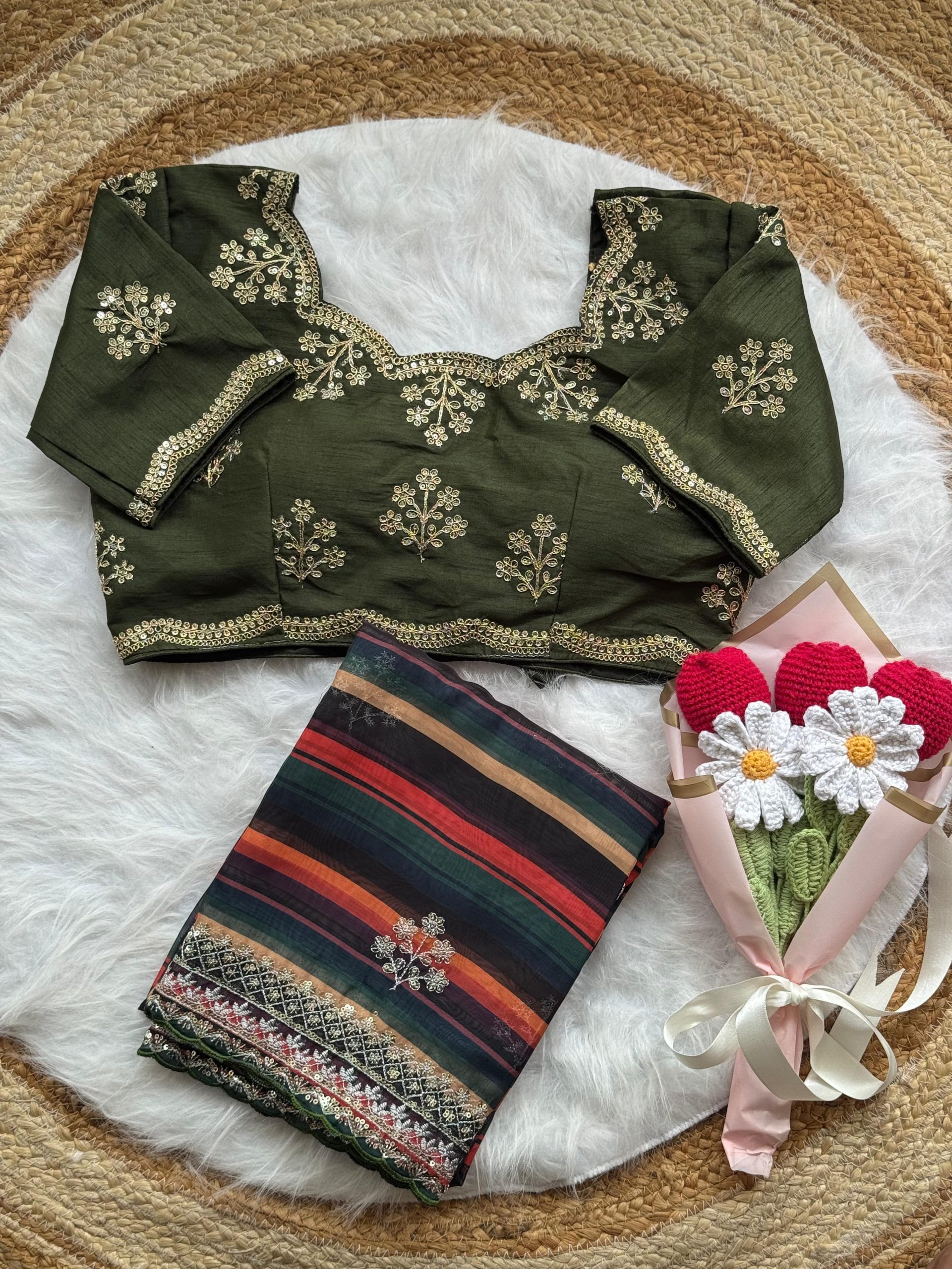 Saree : Soft Organza (TABBY SILK) Work : Heavy Embroidery Work Of Sequence And Jari With Arca Border Blouse ; Mono Banglori Blouse Fabric Work : Designer Blouse, Heavy Embroidery Work Of Coding Sequence And Jari Full Stitched Blouse |