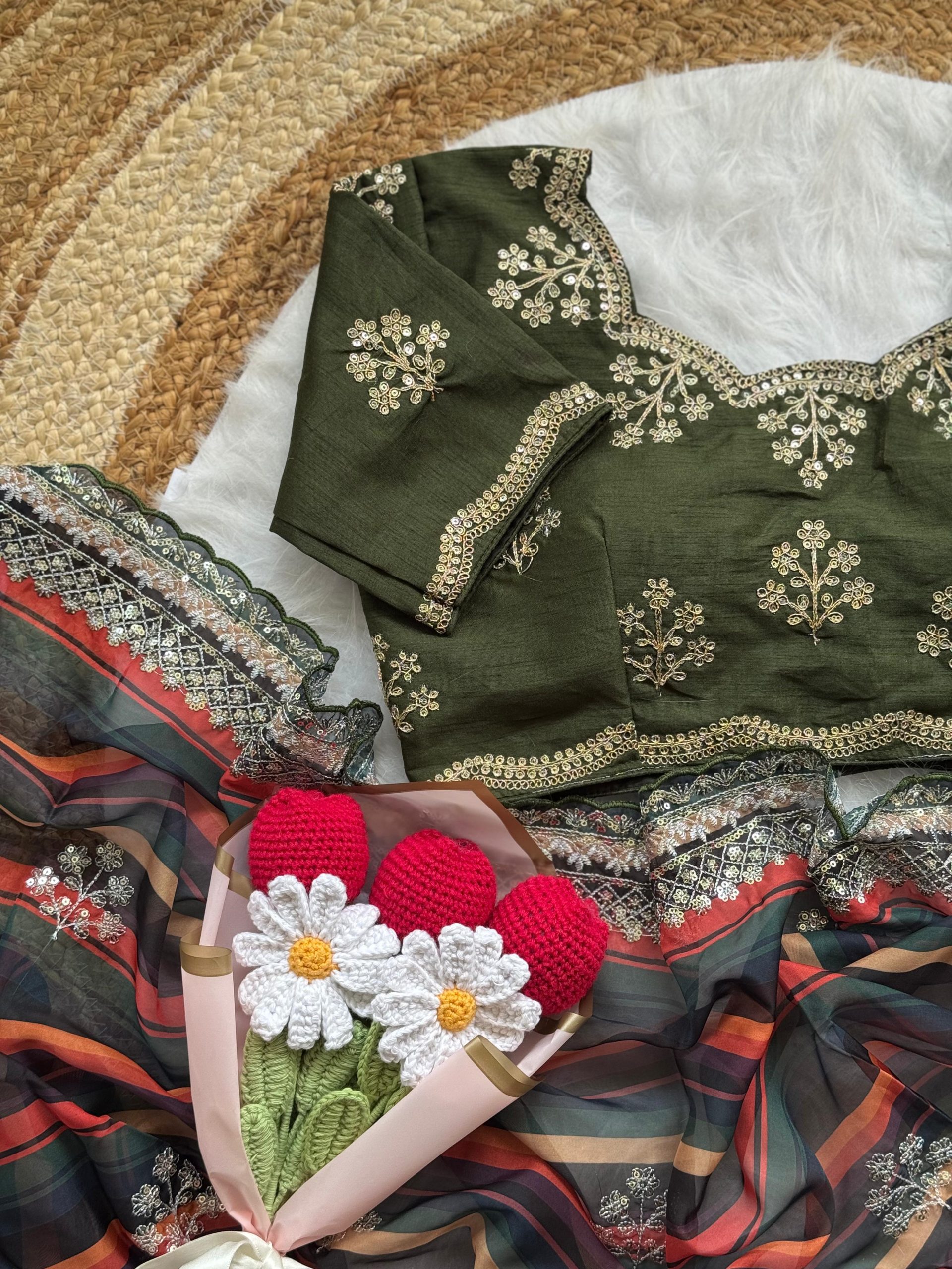Mehandi Soft Organza Embroidery Work Lace Saree
