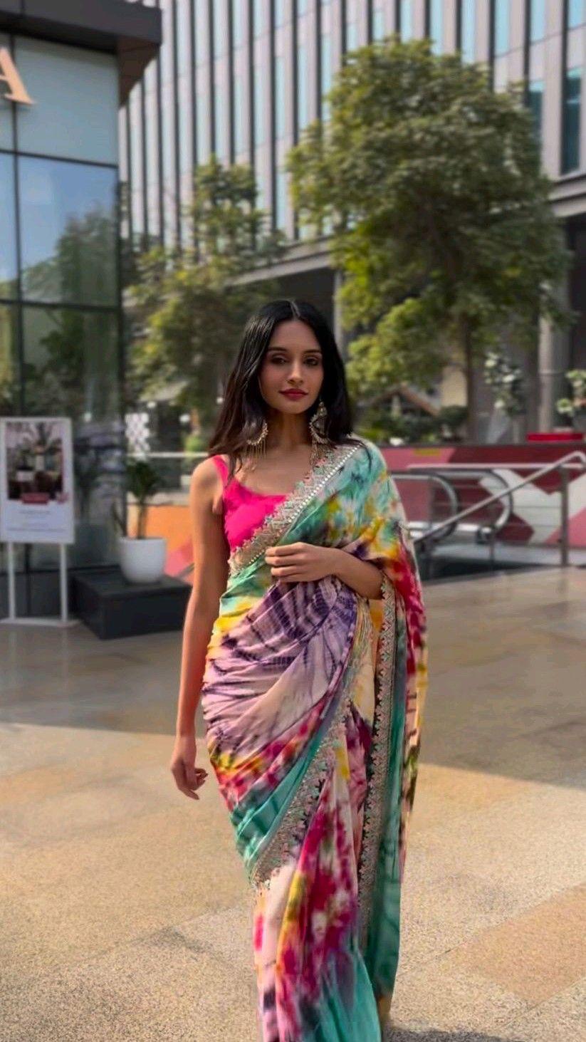 Fabrics | Saree :Pure shibori printed Chinon fabric saree with Beautiful Multicolored Embroidery Coding Sequins Lace work :Embroidery Coding Sequins Lace Blouse : contrast Blouse with attached same lace on blouse |