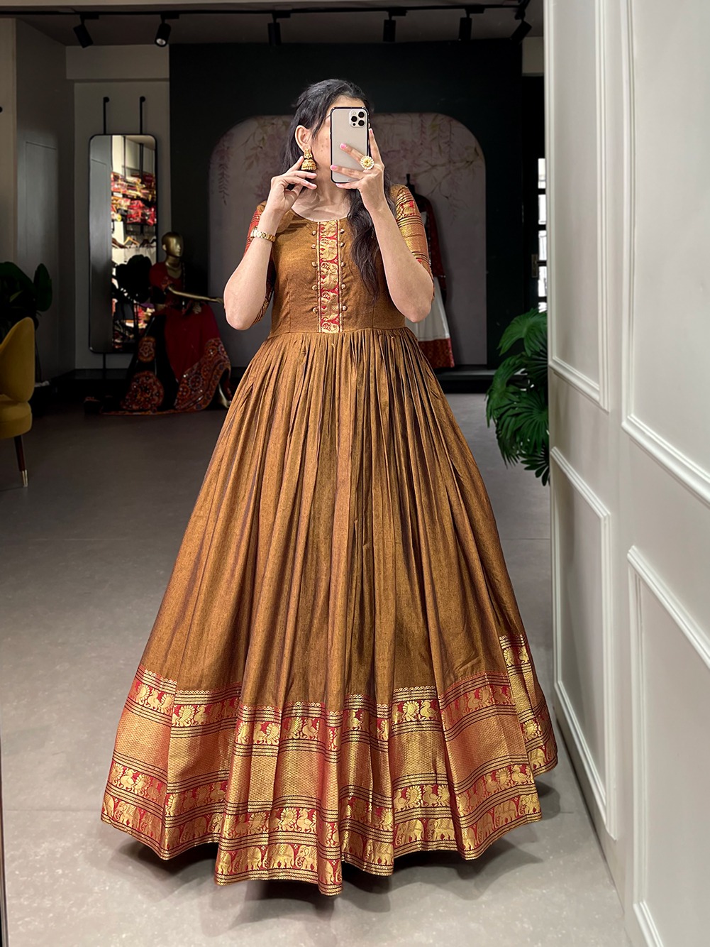 | Fabrics | Gown Fabric : Narayan pet (cotton) Gown Work : Zari weaving work Gown Chest : 40″ (Inside 2 inch extra margin available so you can adjust support up to 42 for your body comfort) Stitching : Stitched With Canvas Gown Waist : 38″ Gown Length : 57 Sleeve length : 12 Shoulder : 15 Flair : 3.50 Meter Lining : silk (full upto bottom) |