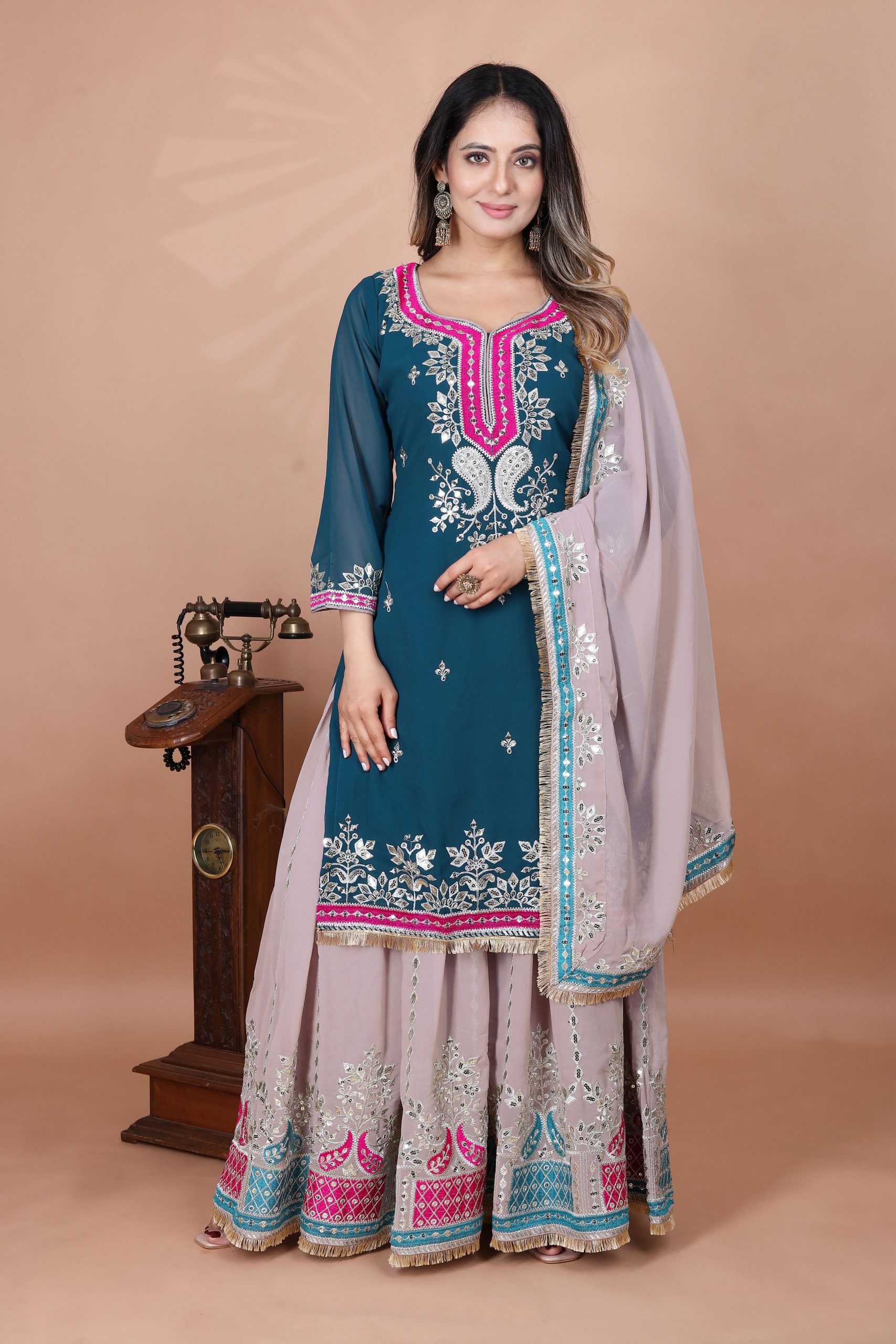 Top Top FabricΒ Β :Heavy Faux Georgette With 5mm Embroidery Sequence Work With Full Sleeve Top Length:- 39-40 inch Top InnerΒ :Heavy Micro CottonΒ Top Size. : Free Size Semi Stitched (FULLY STITCHED READY TO WEAR) Sharara Sharara Fabrics :Heavy Faux Georgette WithΒ 5mm Embroidery Sequence Work Pent innerΒ Β :Heavy Micro CottonΒ Pent Length:40-41 Inch (fully stitched) DupattaΒ Dupatta Fabric :Heavy Faux Georgette WithΒ 5mm Embroidery Sequence WorkΒ Dupatta Length: 2.10 MTR |