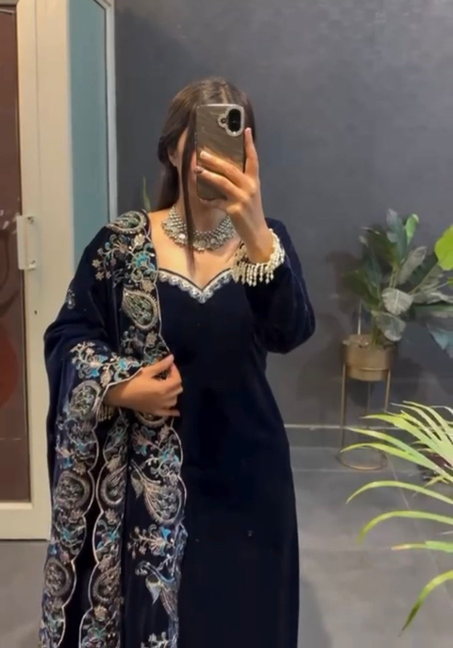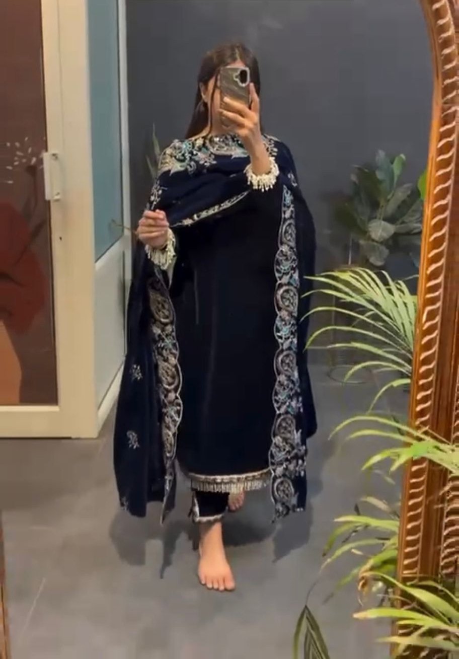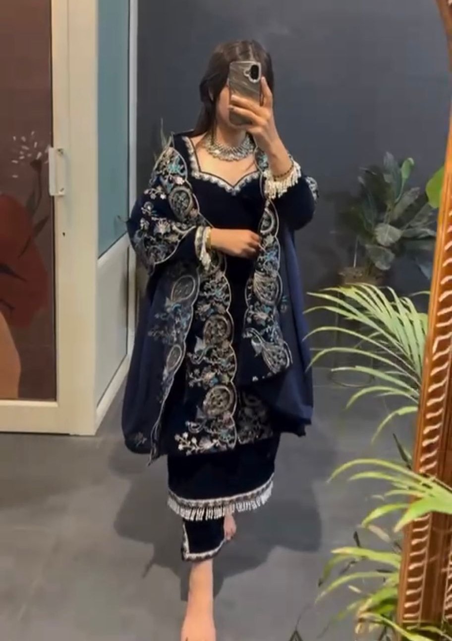 Navy Blue Viscose Velvet Lace Work Salwar Suit
