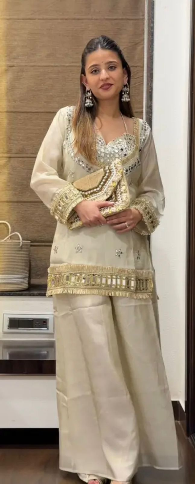 Off White Fendy Silk Mirror Lace Work Salwar Suit