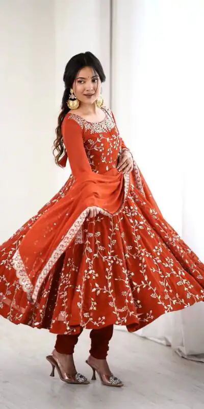 GOWN: Fabric: Heavy Faux Georgette With Embroidery Sequence Work With Fully Flair Sleeves: Full Inner: Heavy Micro Cotton Length: 45-46 inches Flair: 4.5 Meter Sizes : Free Size Semi Stitched BOTTOM Chudidar Fabric: Micro Cotton Length: 49-50 inches DUPATTA: Fabric: Heavy Faux Georgette Design: Embroidery Sequence Work With Lace Border |